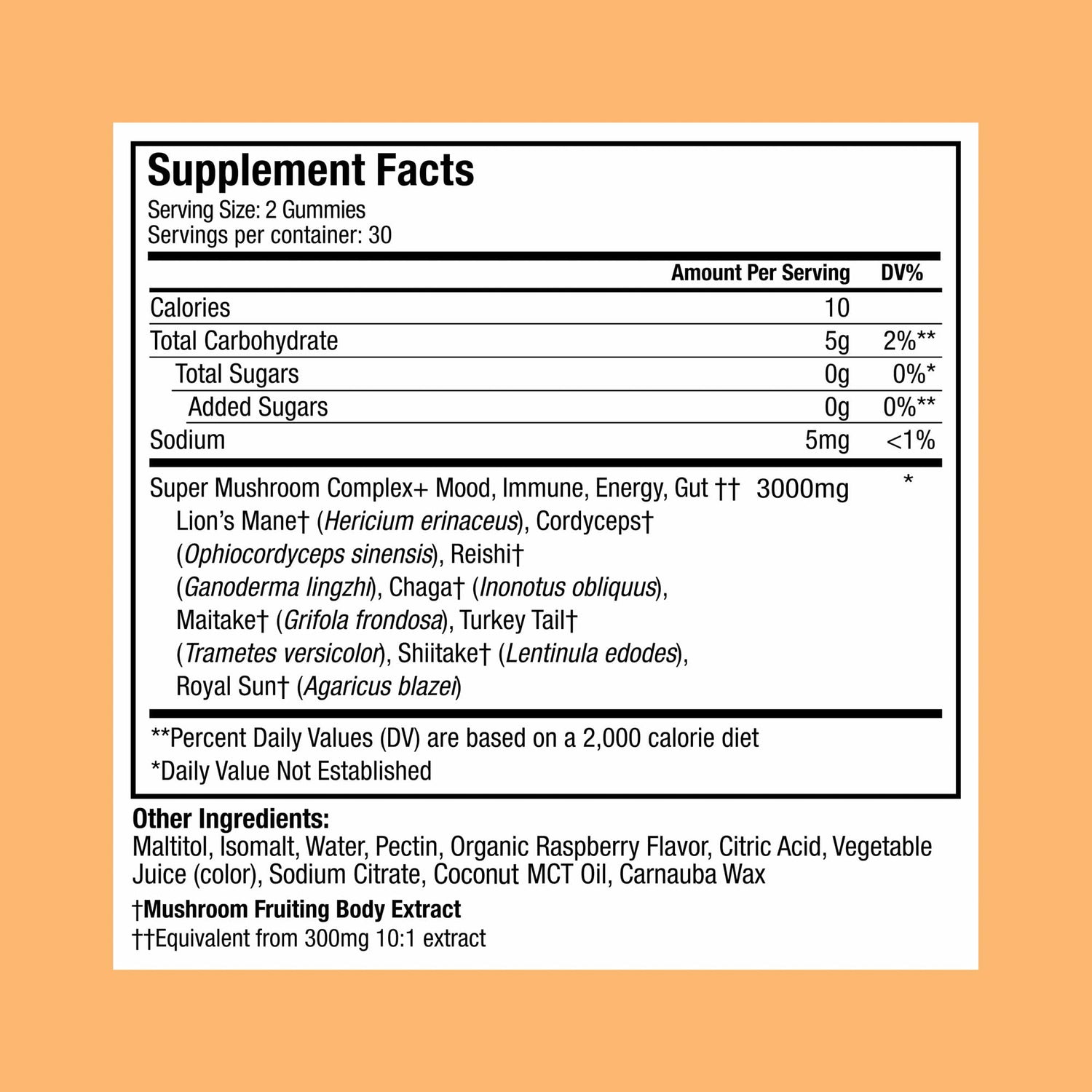 - Say no to caffeine or chemicals - Our cordyceps mushroom gummies are safety tested. This vegan lion's mane mushroom supplement is free from GMOs, gluten, corn syrup, dyes, or gelatin. Enjoy 2 gummies per day with a heavy dose of 2500 mg per serving. We source US-cultivated functional mushrooms.
