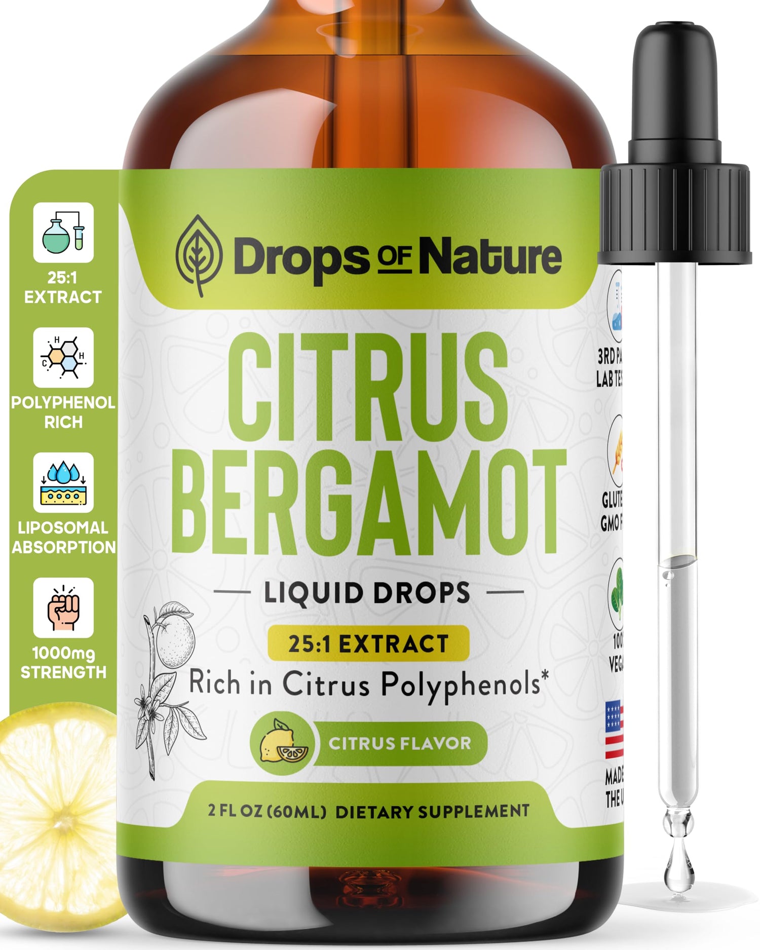 Citrus Bergamot Extract 25:1 Liquid Drops – Vegan, Gluten-Free – Comparable to Resveratrol and Berberine Supplement – 1000mg Bergamot Supplement for Heart Wellness and Metabolic Support (Citrus,60mL)