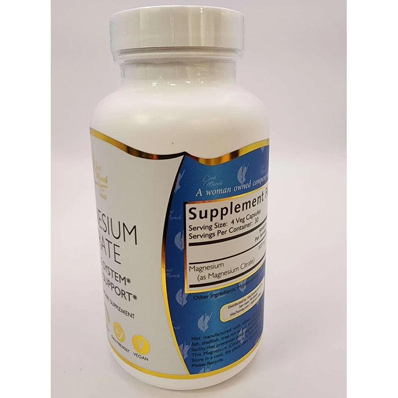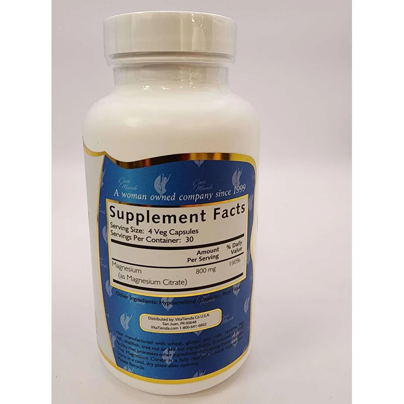 Coco March Magnesium Citrate - Relaxation- Sleep - Nervous & Digestive System Support, Gluten Free, Soy Free, Dairy Free, Keto Friendly, Vegan, 800 mg per Serving, 120 Capsules - 30 Servings