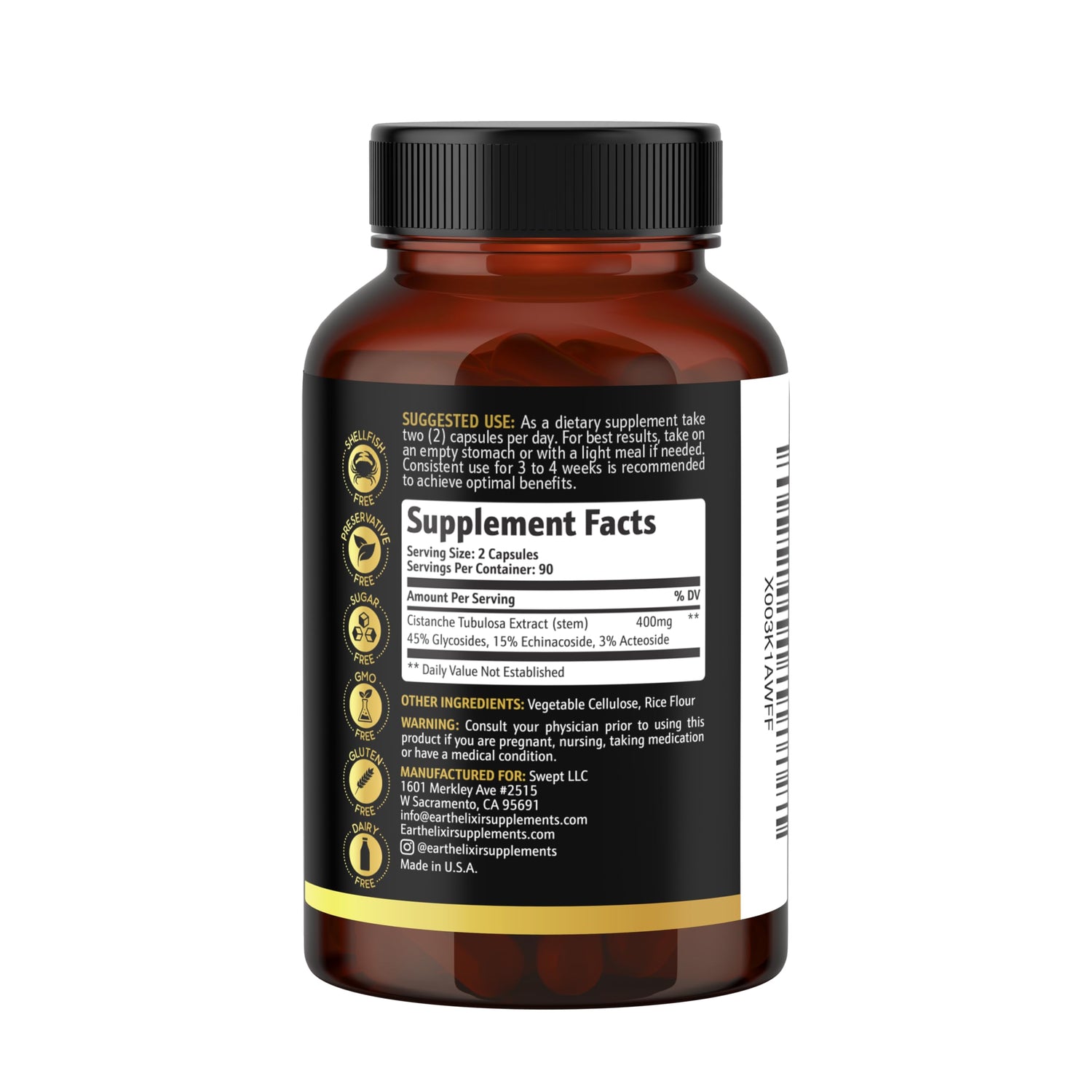 Earth Elixir Cistanche Tubulosa 400 mg (180 Capsules) 3 Months Supply – Made in USA - 3rd Party Tested - Cistanche Supplement - Zero Fillers - Max Purity - Nootropics - 100% Pure Cistanche Herb