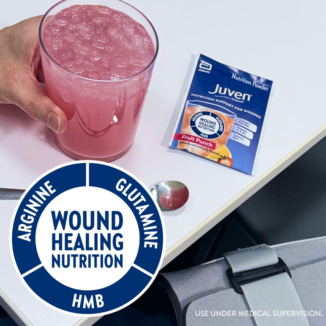 Details: Juven is a therapeutic nutrition powder with key ingredients to help support wound healing. Its blend of specialized micronutrients includes amino acids, HMB, collagen peptides, calcium, zinc, and vitamins C, E, and B12. Use 2 packets of Juven per day in addition to any other wound care recommendations from your doctor. Available in unflavored, orange, fruit punch, and pineapple coconut flavors. Use under medical supervision.