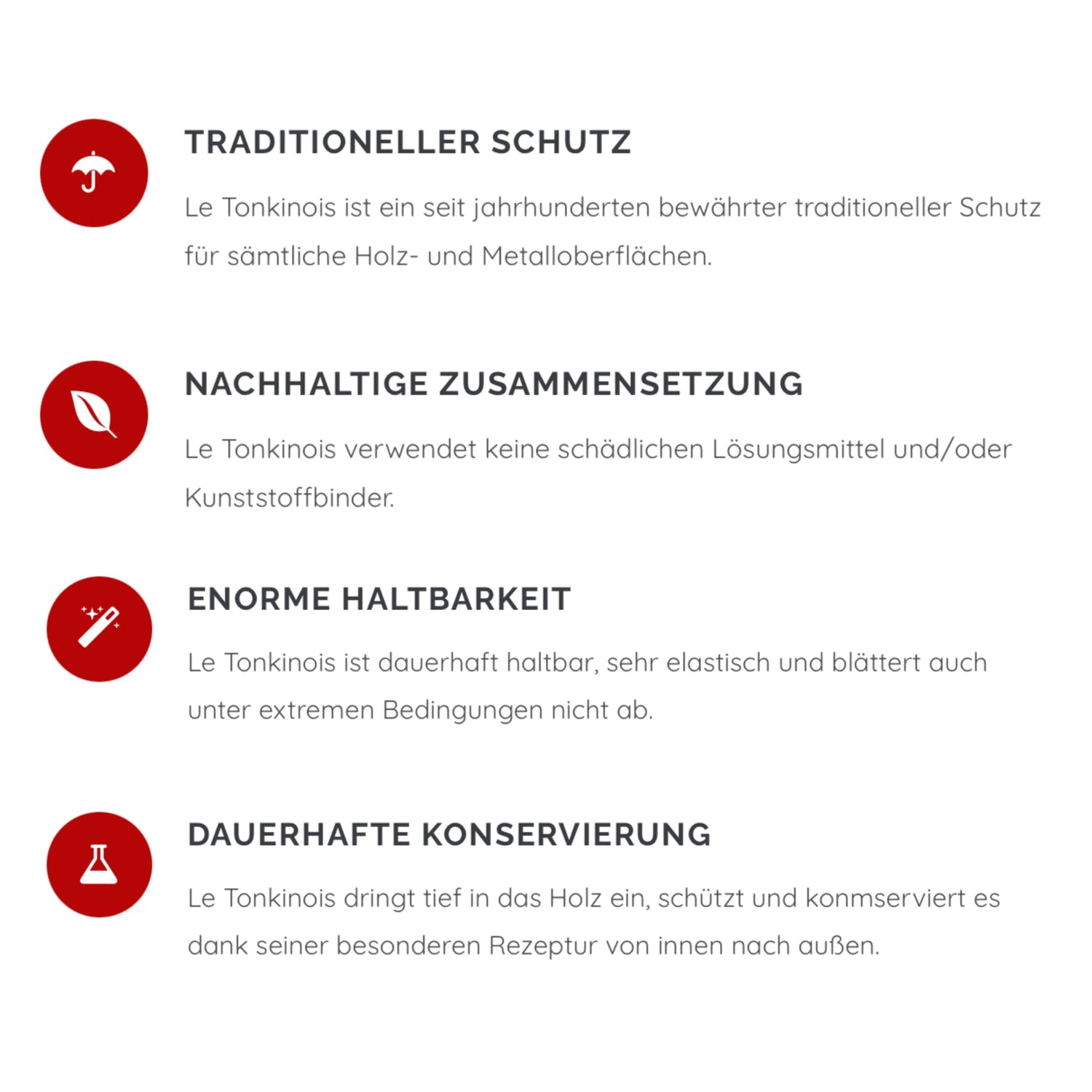 - Le Tonkinois is a special and natural varnish oil for various types of wood indoors and outdoors, even on degreased metals. It is abrasion and shock resistant and has good lightfast and UV resistance.