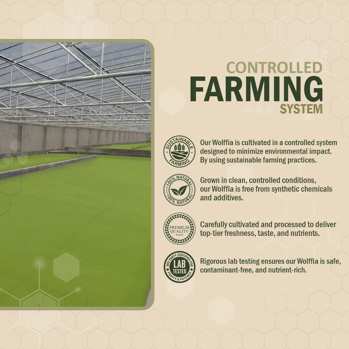 • Sustainably Grown: Grown in a controlled system, Wolffia is free from harmful chemicals and synthetic additives. You can enjoy this superfood with confidence, knowing it's pure, clean, and 100% natural.