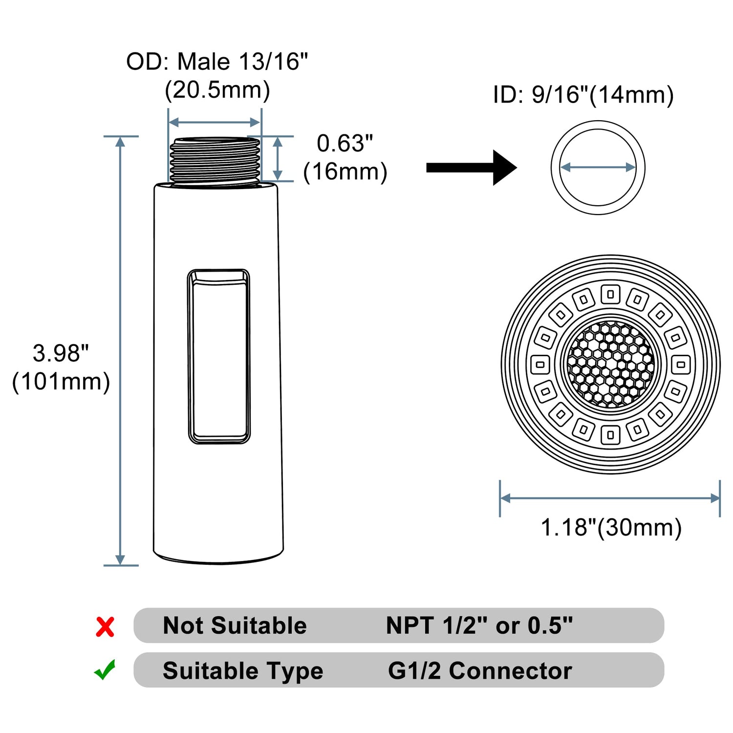 - 【DIMENSIONS】Outer diameter of the male connection of this pull down faucet head is 0.8" (13/16" or 20.5mm), the inside diameter is 0.55" (9/16" or 14mm). Please check the size and thread type before ordering.
