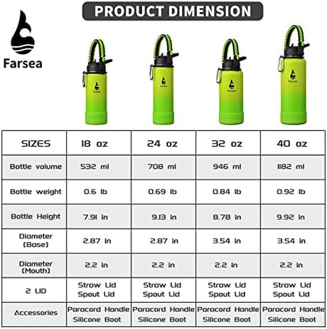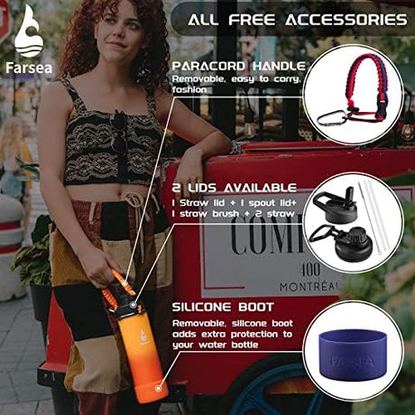 Farsea Insulated Water Bottle With Paracord Handle, Protective Silicone Boot and 2 Lids (Straw Lid & Spout Lid), Stainless Steel Water Bottle Wide Mouth, Double Wall Sweat-Proof BPA-Free, 32 oz