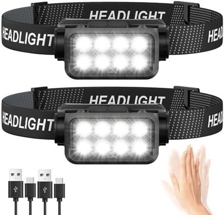 Rechargeable Headlamp Flashlight 2-Pack, 8 LED 2500 Lumen Ultra-Light Bright Headlight with Motion Sensor, Waterproof Lightweight Head Lamp for Adult Kid, Headlamps for Outdoor Camping Running Fishing