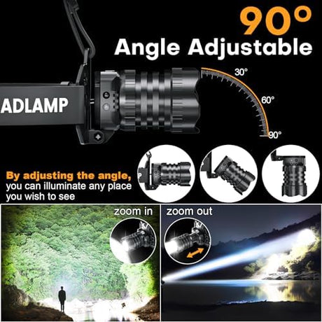 LED Rechargeable Headlamp, Head Lamp Super Bright with 9 Modes & IPX6 Waterproof Zoomable Head Lights for Forehead, 90° Adjustable Headlamps for Camping Hiking Hunting Fishing Car Repair