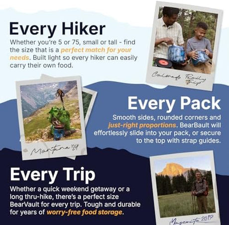 Canister for Backpacking. 4 Sizes: BV500, BV475, BV450, BV425. Bear-Resistant Food Container for Camping, Hiking, Fishing, Hunting, Bikepacking. BearVault is Bear Safe!