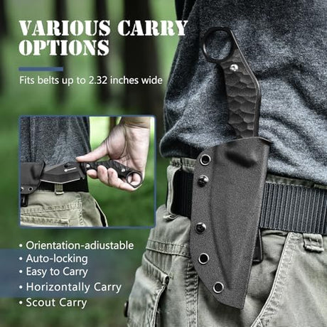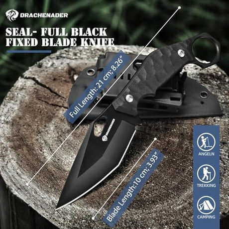 Survival Knife SEAL-FULL BLACK 9" EDC Fixed Blade Tactical Horizontal Carry Knife for Men with Kydex Sheath, 5mm Thick Stainless Steel, G10 Anti-Slip Handle, Ideal for Gifting, Full Black