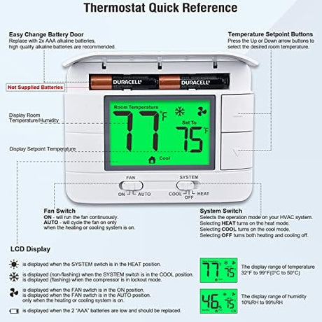 Upgraded Non Programmable Thermostats for Home 1 Heat/1 Cool Single Stage System, with Temperature & Humidity Monitor and Large Green LCD