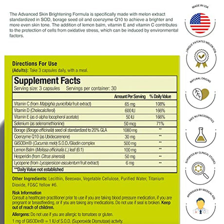 Glisodin Skin Nutrients Advanced Skin Brightening Formula – for Brighter, Clearer, and Firmer Complexion – Helps Reduce Blemishes - 90 Capsules