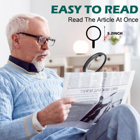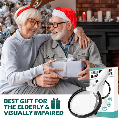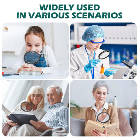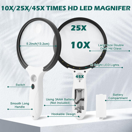 Large Magnifying Glass with Light, 10X 25X 45X Handheld Illuminated Magnifier with 3 Light Modes, 12 LED Lights, Storage Bag, Clean Cloth for Seniors Reading Coins Inspection (Black, Round)