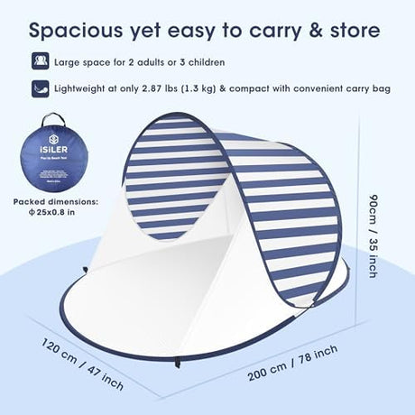 ISILER Pop Up Beach Tent, Portable Outdoor Shade, UPF 50+ Baby Shelter, Easy Setup Windproof Waterproof Canopy