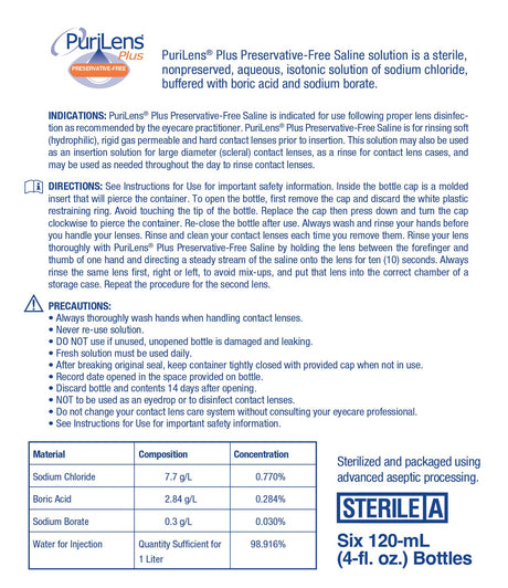 Purilens Plus Preservative-Free Contact Lens Saline 120ml (4 fl. oz.) 6 Pack