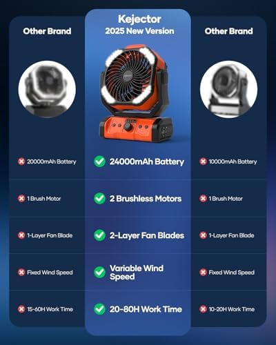 kejector Portable Camping Fan Rechargeable - 23000mAh 3-in-1 Battery Powered Fan with LED Lights, USB C, Auto Oscillating Portable Fan for Tents, Travel, BBQ, Fishing, Home, Office, Camper Essentials
