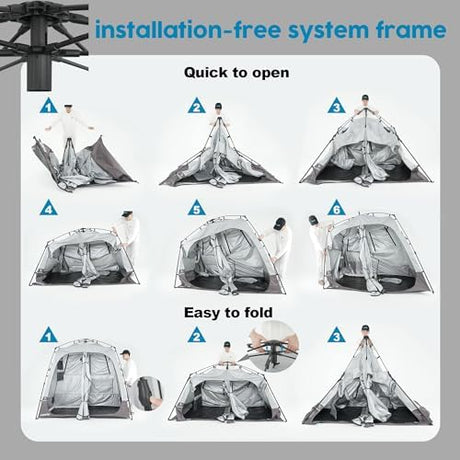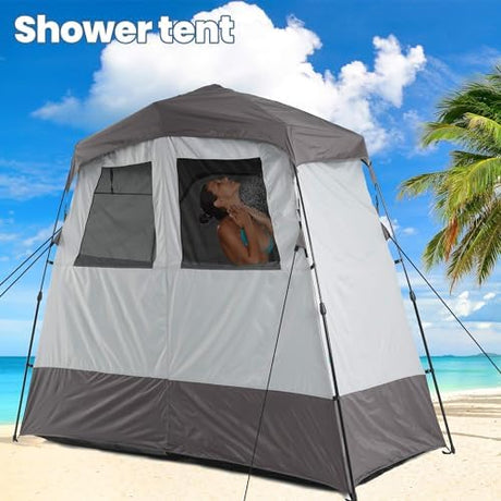 Camping Shower Tent Deluxe Changing Room Easy Set Up Privacy Shelter,Large Toilet Tent 2 Rooms with Floor Drain Design for Beach, Camping,Hiking with Stakes and Ropes for Stability