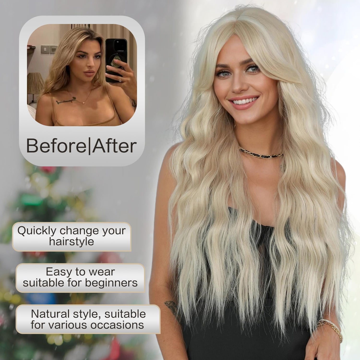 7JHH WIGS Long Wavy Ash Blonde Wig with Curtain Bangs Heat Resistant Fiber Layered Synthetic Curly Wig for Cosplay Christmas Gifts Party Used