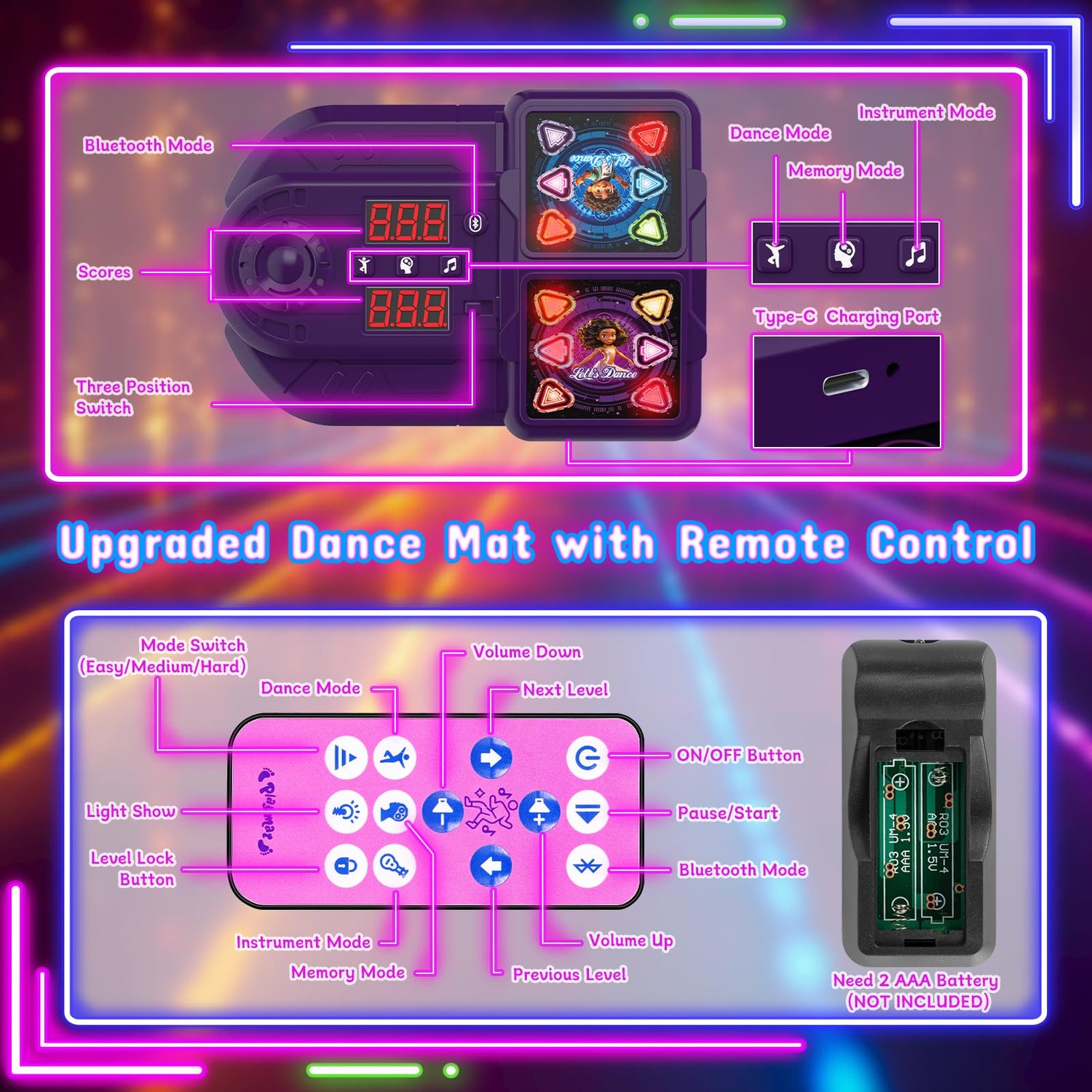 - Exciting Instrument and Light Show Functions Bring Even More Fun --- Our kids dance mat features classic modes (Dance, Memory, Bluetooth) as well as the new Instrument and Light Show modes, transforming every dance into a creative experience! 【Instrument Mode】: The dance mat produces drum and piano sounds, allowing kids to create a unique musical experience that enhances creativity and interactivity in their dance. 【Light Show Mode】: The lights flash to the beat of the music, elevating the dance atmosphere and creating a stunning visual display that immerses players in an energetic experience!