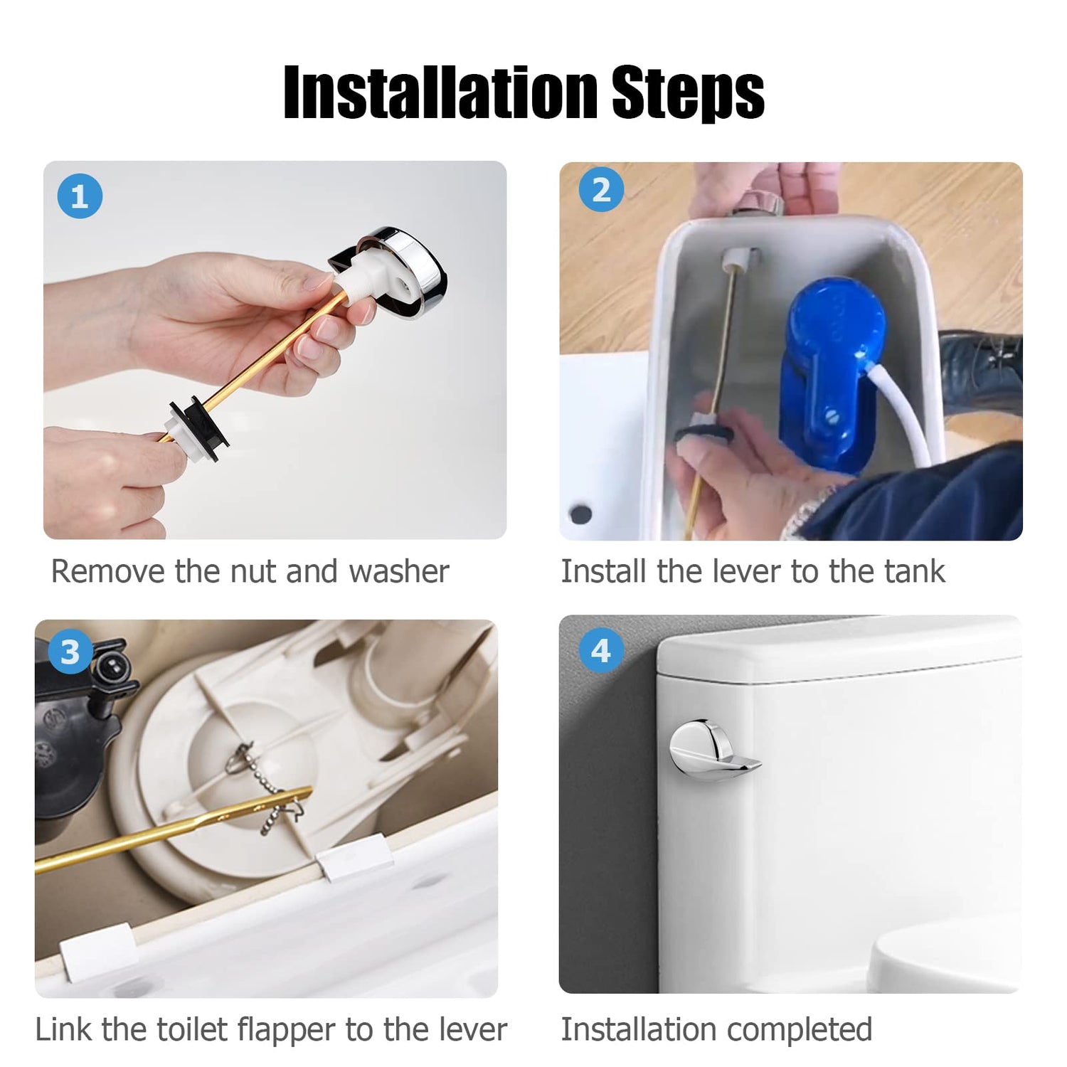 - Easy to Install: Just remove the old parts and align the new replacement parts to properly install them. You can easily install them without maintenance personnel. The locknut helps prevent loosening over time. There are three holes at the end of the lever, and the length can be flexibly adjusted according to your toilet water tank.