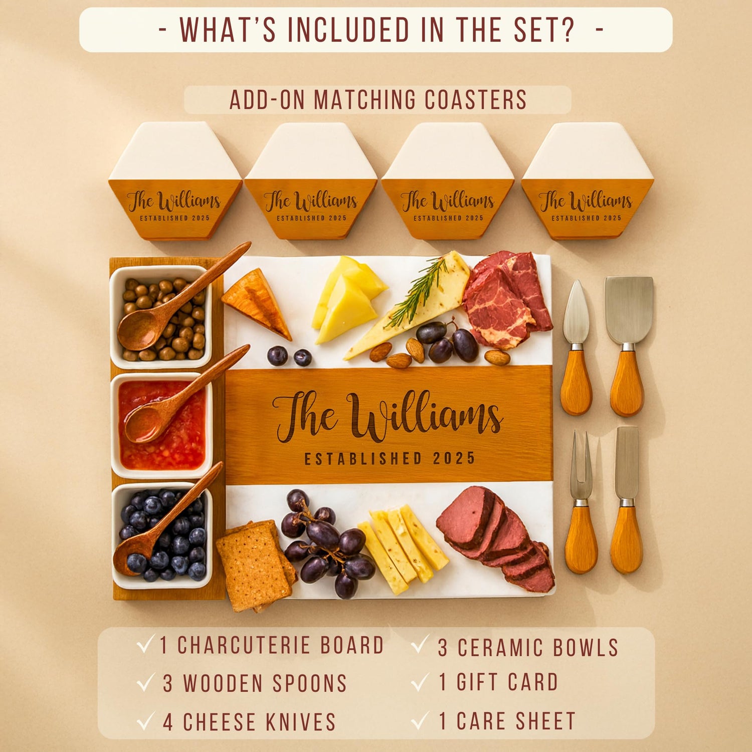 - Custom Engraved Holiday Gift for Couples & Families : Personalize this charcuterie board set as a unique Christmas gift, anniversary present, wedding favor, or housewarming gift. A thoughtful engraved keepsake that will be treasured for years.