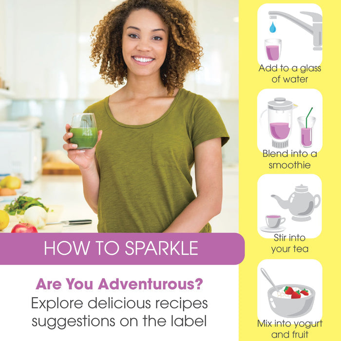 Details: Sparkle Skin Boost Orange Mixed Berry Powder is easy to prepare. Here are some simple suggestions. Just Add Water: Pour one scoop of Sparkle into a glass of water and stir. Best done with room temperature water, and then chill afterwards by adding ice. Blend in to Smoothies: enjoy a lusicious fruity fusion of strawberries, raspberries and blueberries, when added to a smoothie.Simply add Sparkle to your smoothie preparation before you blend. With Tea: Sparkle's light berry flavors complements many teas.Sparkle can be added to hot or cold beverages. Mix one scoop into your cuppa and enjoy! Mix with Yogurt: Sparkle can be added to food too! To add Sparkle to your yogurt, add one scoop, then mix well. Then add the yogurt to your morning bowl.