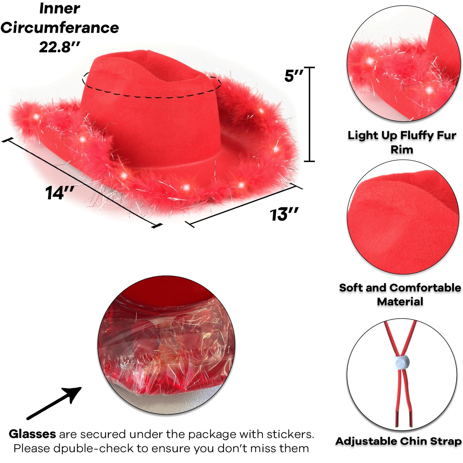 - ALL-INCLUSIVE COWGIRL SET: Embrace your inner cowgirl with our complete set, featuring a fur-rimmed, red light up cowboy hat and preppy heart-shaped glasses. Perfect for those aspiring rodeo princesses, these accessories will turn any outfit into a cowgirl costume.