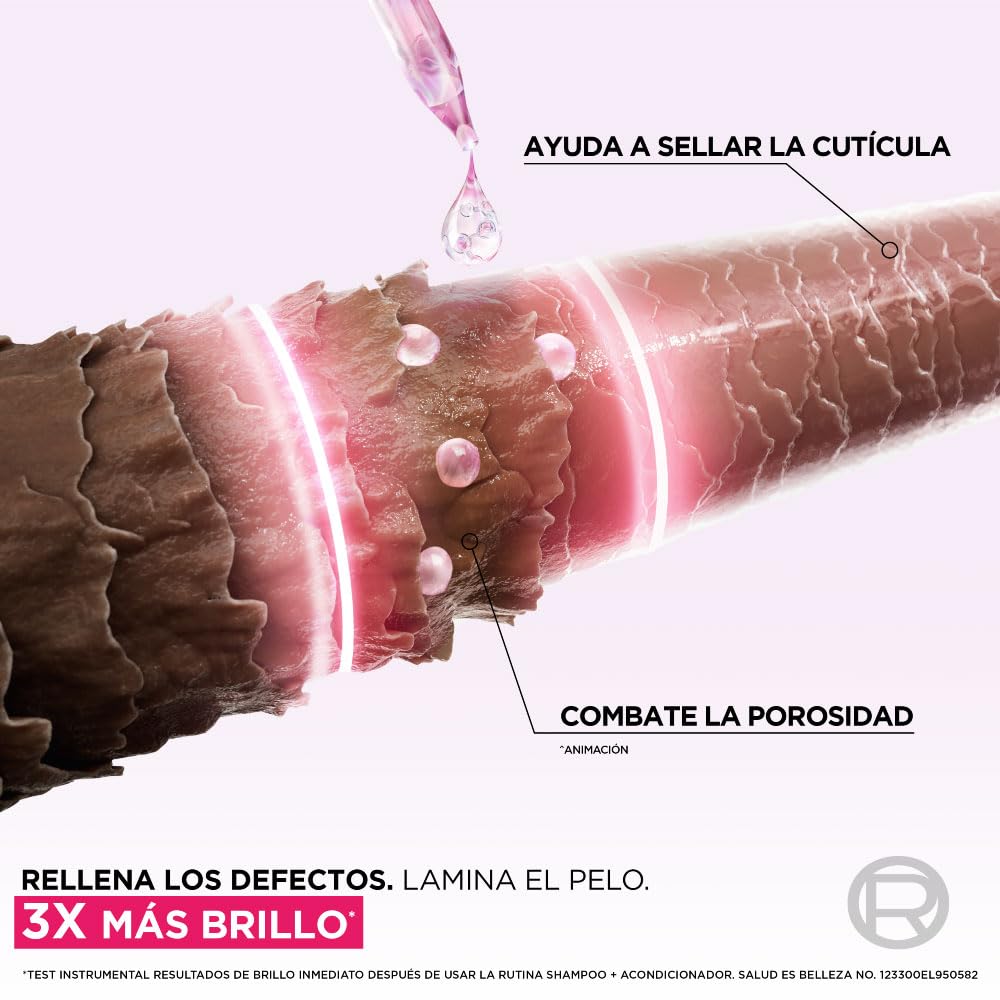 Detalles: La tecnología de Elvive Glycolic Gloss rellena los defectos de la fibra capilar combatiendo la porosidad y ayudando a sellar la cutícula del pelo para brindar un efecto laminado y brillante. El complejo con ácido glicólico cuenta con fórmulas de pH ácido que ayudan a laminar la cutícula del pelo para reflejar la luz e intensificar el brillo.