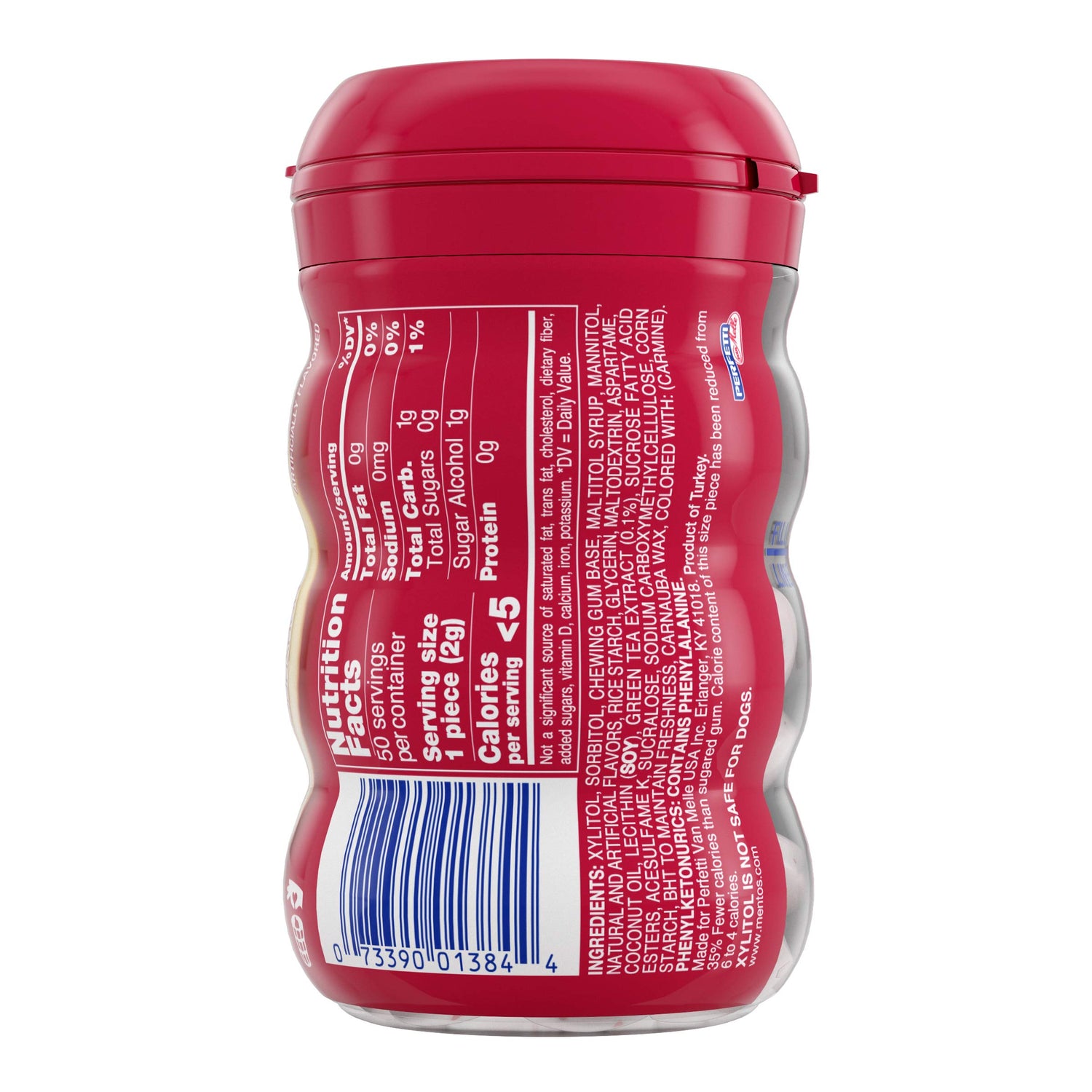 Naturally and artificially flavored. Sugar free. 35% fewer calories than sugared gum. Calorie content of this size piece has been reduced from 6 to 4 calories. Pure fresh with green tea extract. Food safe. www.mentos.com. Product of Turkey.