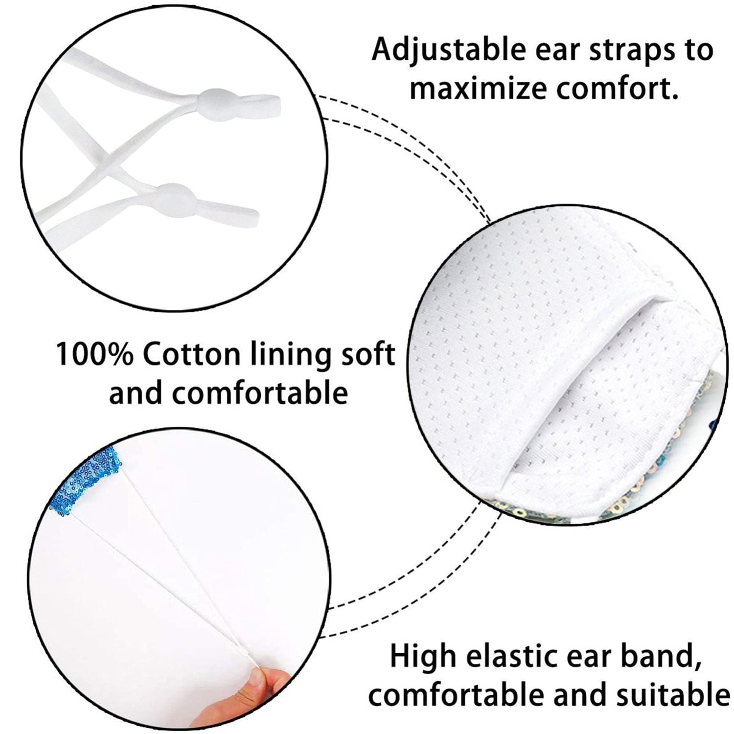 - šćAdjustable ear straps & washableć The sparkly sequined cotton face shield comes with adjustable ear straps. You only need to adjust the position of the plastic buckle to fit you better. Our pure cotton sequin face guard is washable and reusable. It is recommended to use the cleansing face cover once a week to achieve the best results!
