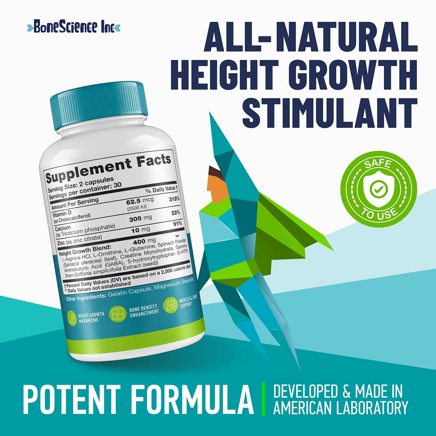 - Height Growth Pills - Growing taller is now possible with the exclusive formula of BoneScience Inc capsules. Since our body does not produce zinc or calcium as the main height drivers, there is a need for regular intake. Perfect for kids, teens, and adults, our growth pills provide a daily portion of essential nutrients to stimulate your height growth naturally and increase bone density safely.