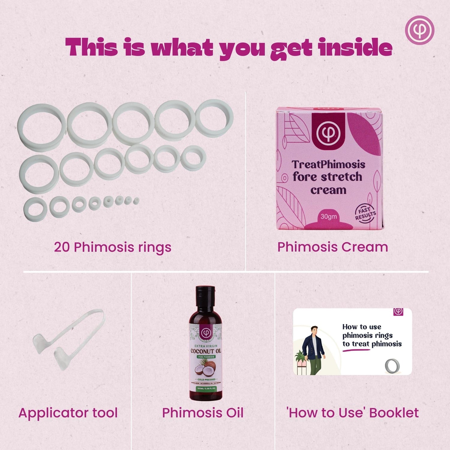 Details: This product comes with 20 phimosis ring (graduating sizes), 1 Phimosis coconut oil or (phimosis cream), 1 ring removal tool, and 1 User manual, which contains instructions to use this product. Details on using the phimosis stretching rings is available inside the package in the form of a booklet.