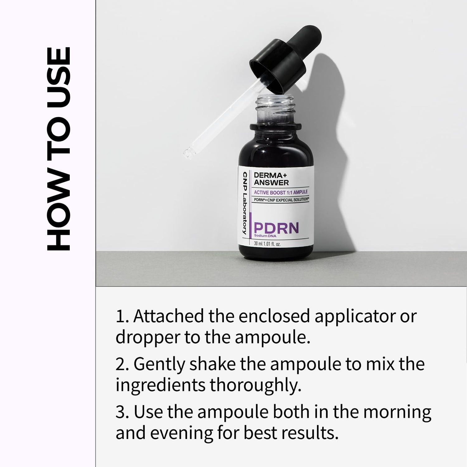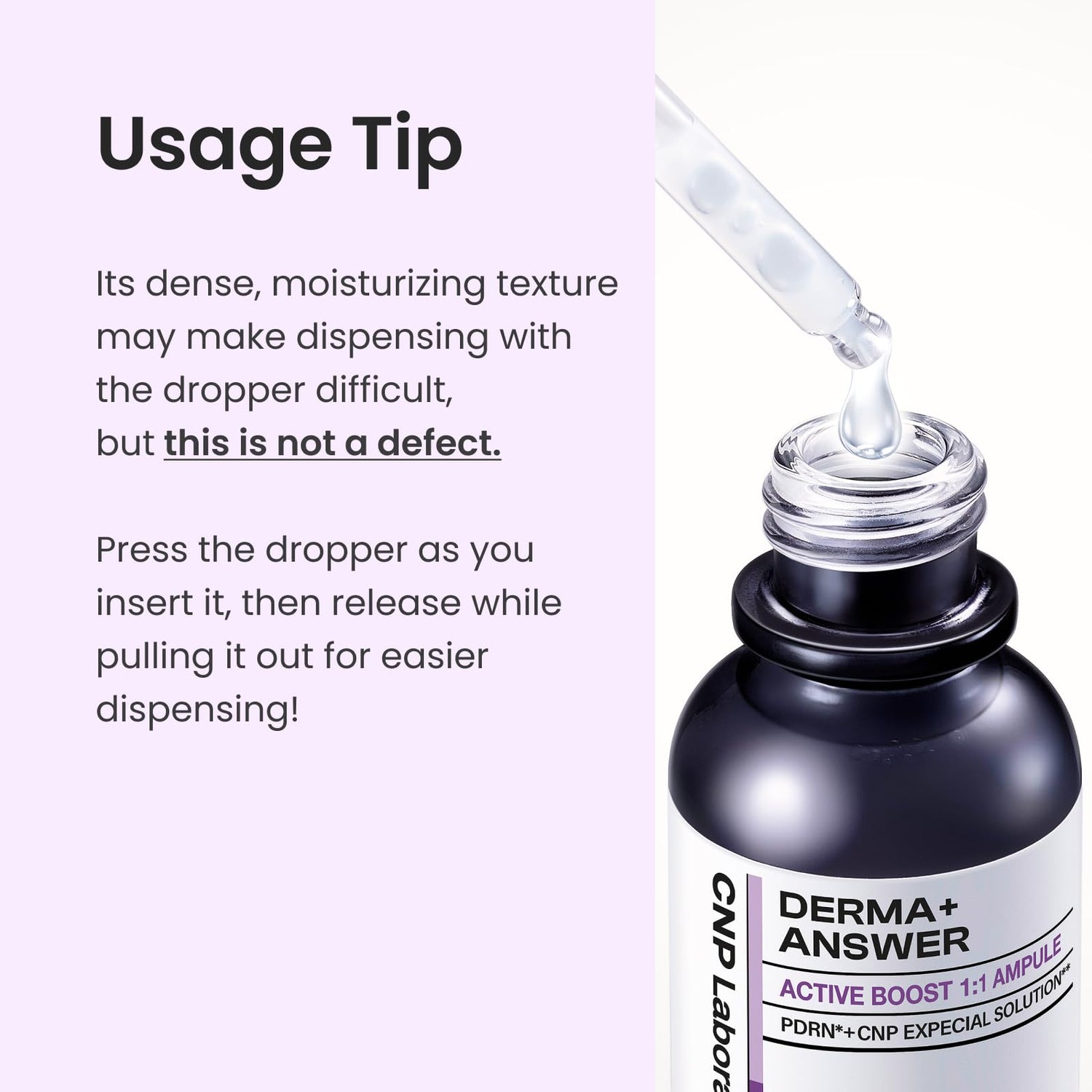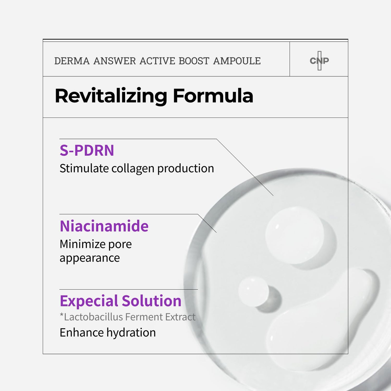 - CNP DERMA ANSWER ACTIVE BOOST AMPULE (30ml/1.01fl oz) - CNP Derma Answer Active Boost Ampule rejuvenates skin by targeting aging signs, enhancing elasticity, and diminishing the appearance of fine lines, revealing a youthful appearance in just 4 weeks.