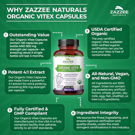 Zazzee USDA Organic Vitex, 500 mg Strength, 120 Vegan Capsules, 4 Month Supply, Standardized and Concentrated 4X Extract, Whole USDA Certified Organic Chaste Berry, All-Natural and Non-GMO