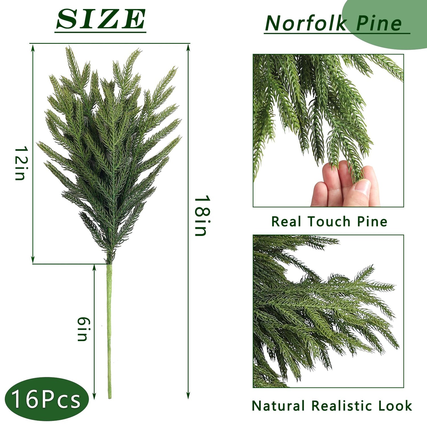 - 【Sufficient Quantity】: One pack of 16 Pcs real touch norfolk pine branches, to provide you with sufficient supply, as shown in the picture, 16 norfolk pine branches can fill the whole vase, fluffy and beautiful, can also make christmas wreath, garland.