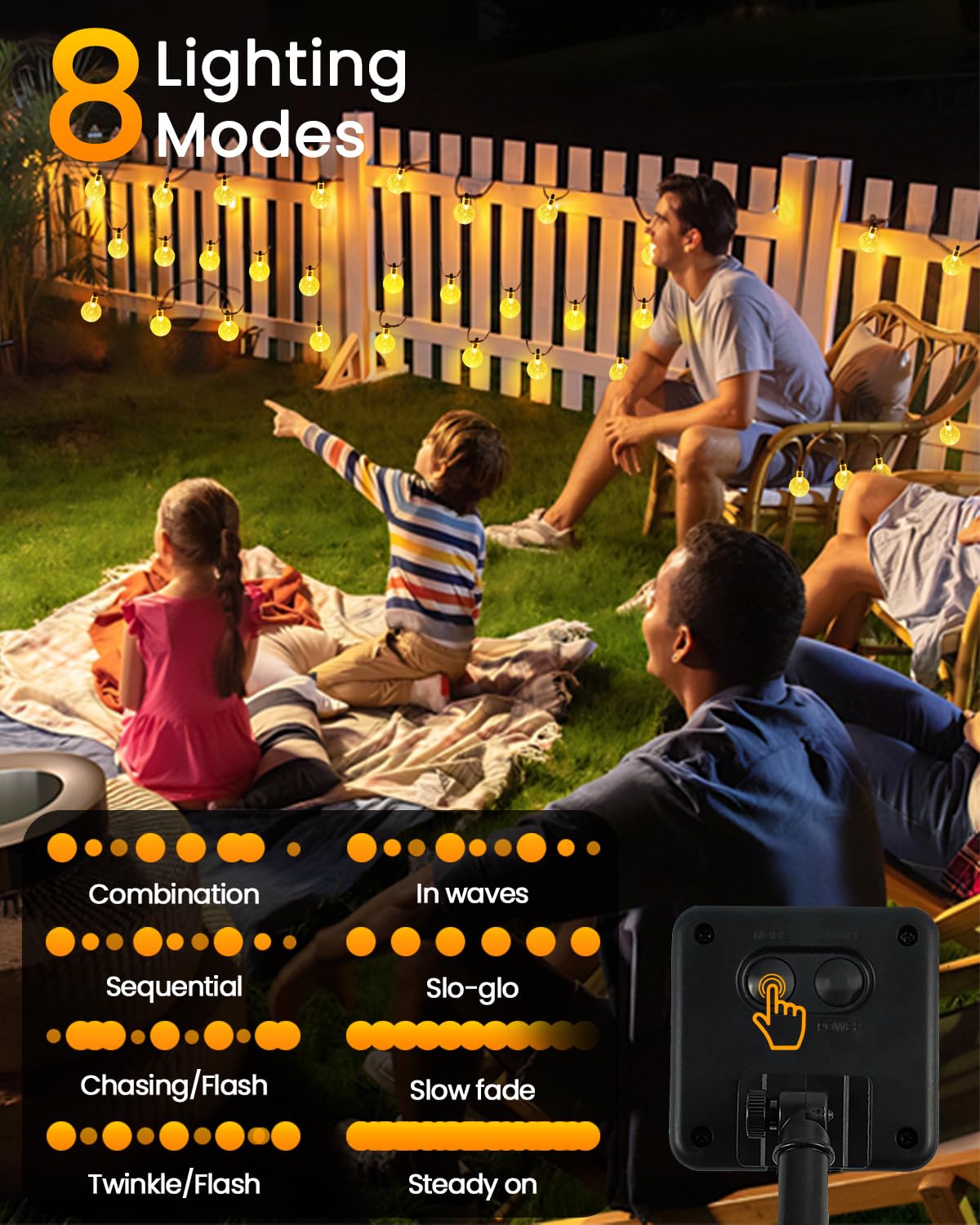- Wide Applications & Memory Function for Convenient Use: The built-in memory chip remembers your last mode setting, eliminating the need for daily resets. Perfect for decorating terraces, pergolas, bistros, backyards, decks, patios, gardens, holidays, weddings, parties, and other celebrations, these solar globe string lights add a touch of magic to any occasion.