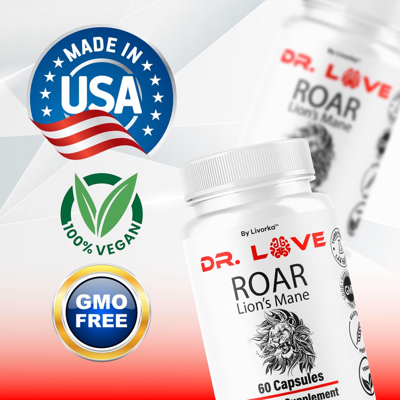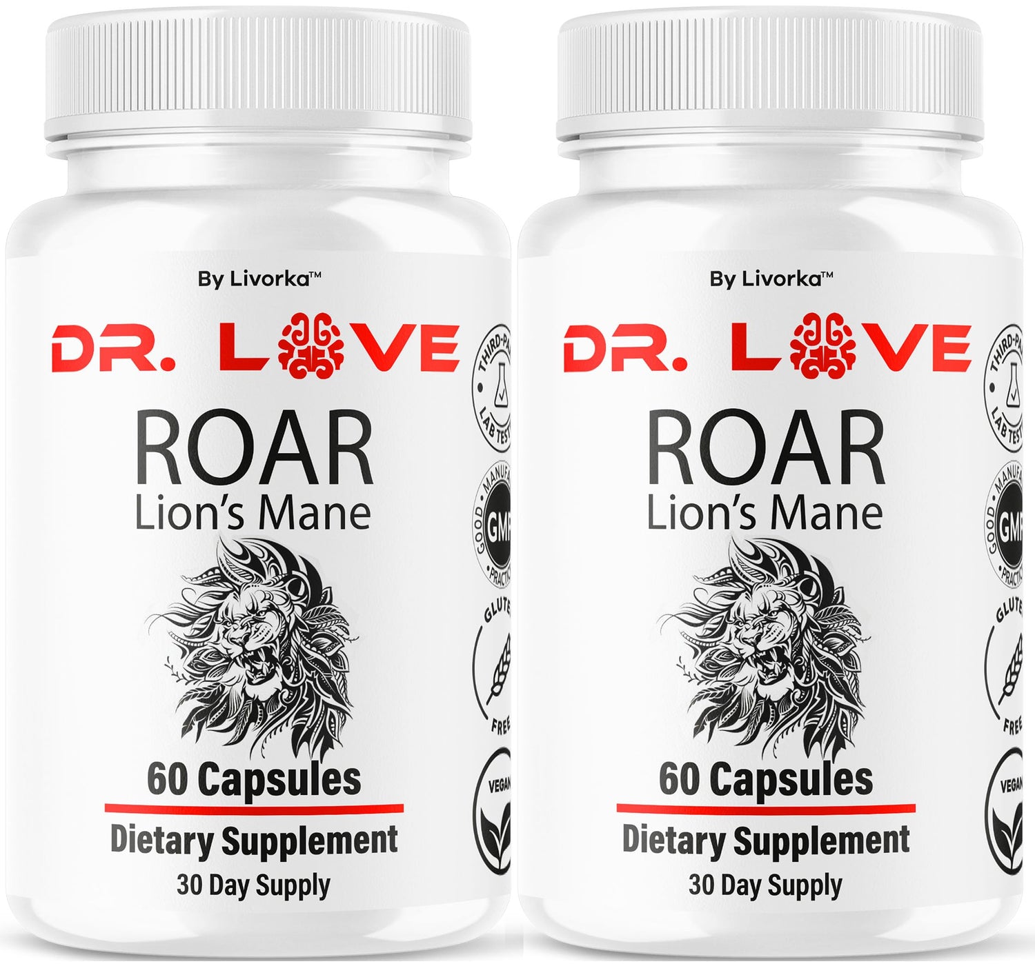 (2 Pack) Dr. Love Roar Lions Mane Supplement Capsules, Dr. Love Roar Lion’s Mane Plus Brain and Focus Premium Advanced Formula, Doctor Love All Natural Support Pills, 120 Capsules for 2 Months