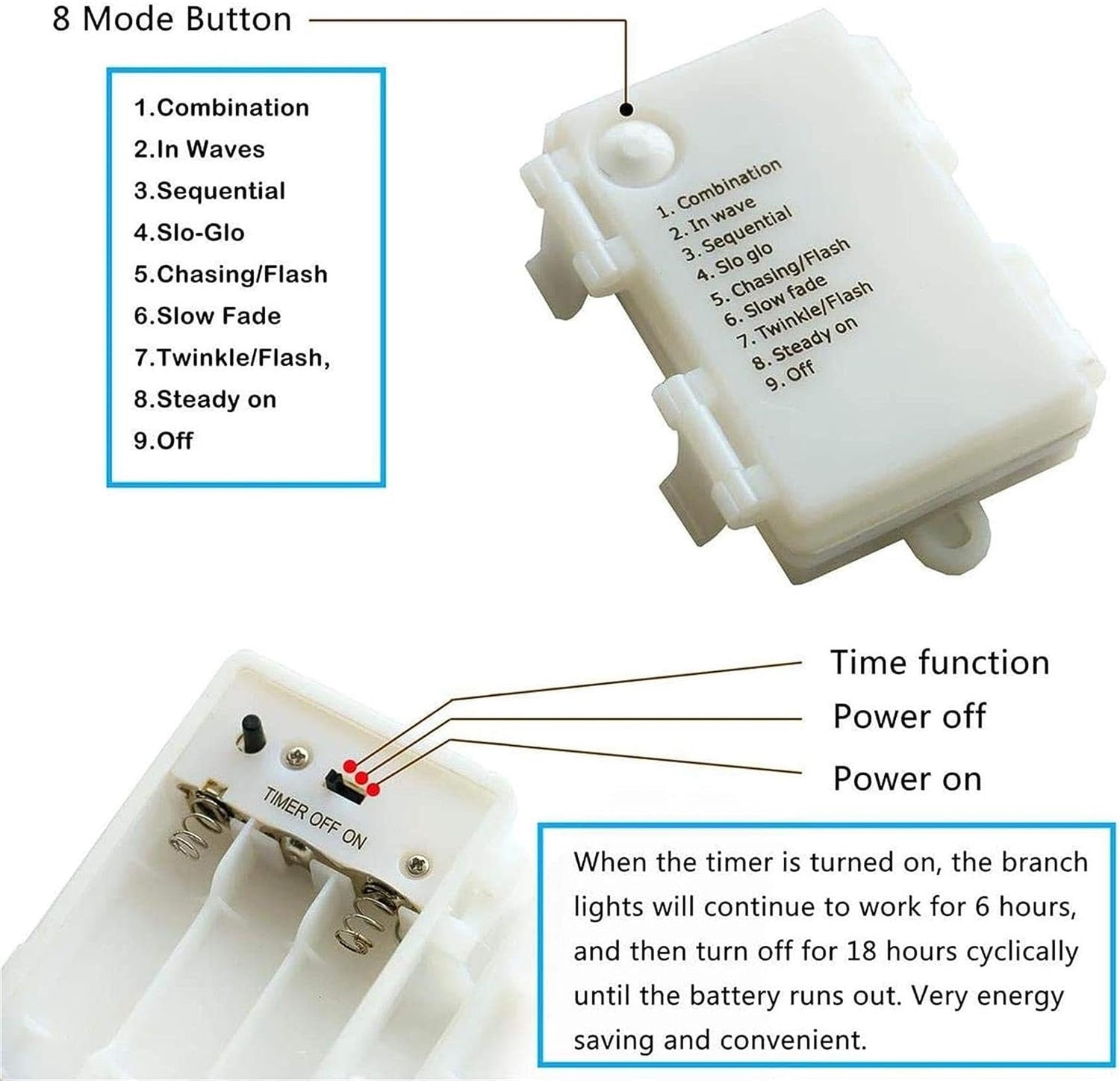 - 【Battery Operated & Timer】: the led branches are battery powered. The battery box is equipped with timer function, which make the lights keep auto running ON for 6hours and OFF for 18hours. Very convenient to use. 8 lighting modes add more fun. (1. Combination; 2. Steady on; 3. Slow fade; 4. In wave; 5. Slo Glo; 6. Chasing/ Flash; 7. Sequential; 8. Twinkle/ Flash).