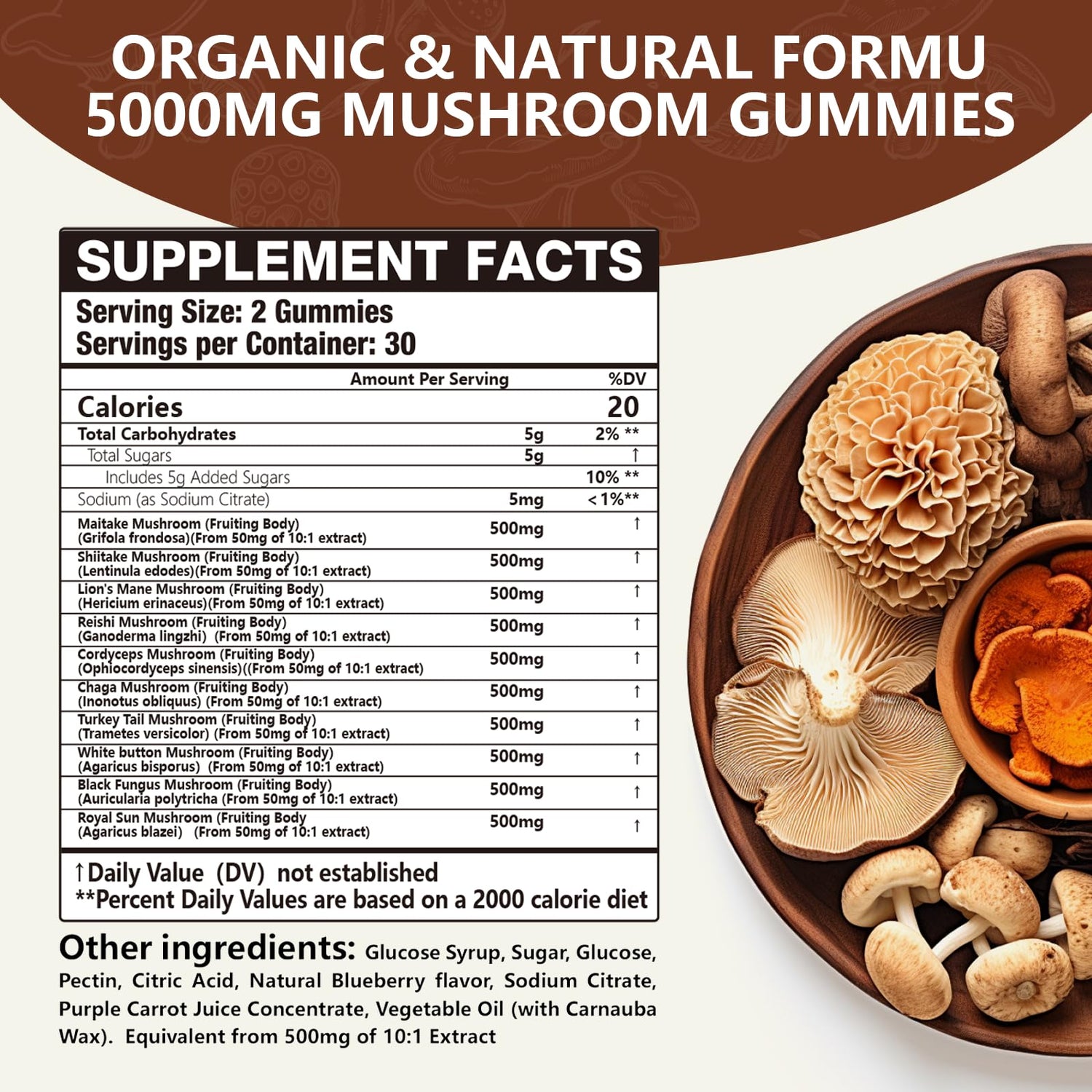 2 Packs 5000MG Mushroom Gummies -10 Blend Organic Mushroom Supplement containing Lion's Mane and Reishi for Brain and Immune Boosting, Vegan Blueberry Flavor, Non-GMO, 120 Counts