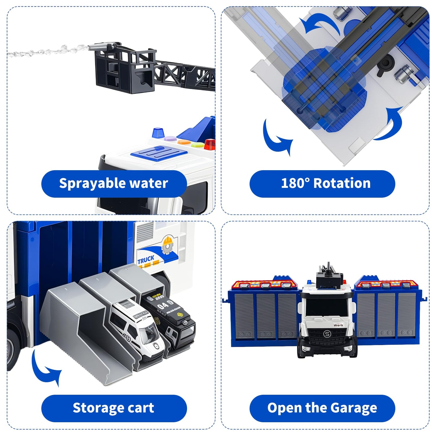 - More Play fun offered : This police carrier truck comes with 6 garages and 6 emergency vehicles including police cars and fire trucks. Unfold dual-sided garages to launch 6 unique cars by pressing each button, transforming rescue missions instantly! It offers a fun and authentic rescue experience