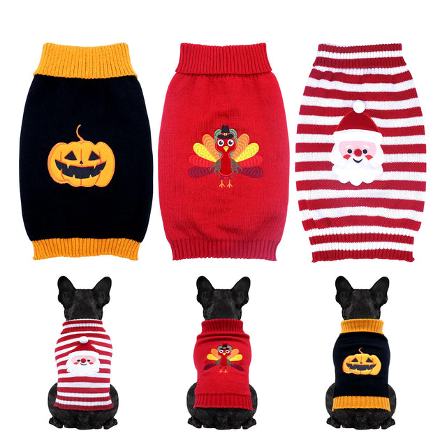 - 🎅HAPPY HOLIDAYS;Dress up your furry friend in festive style with our handmade dog sweater set.Designed with 3 lovely patterns,Santa Claus for Christmas sweater,a playful pumpkin for Halloween sweater,and a charming turkey for Thanksgiving sweater