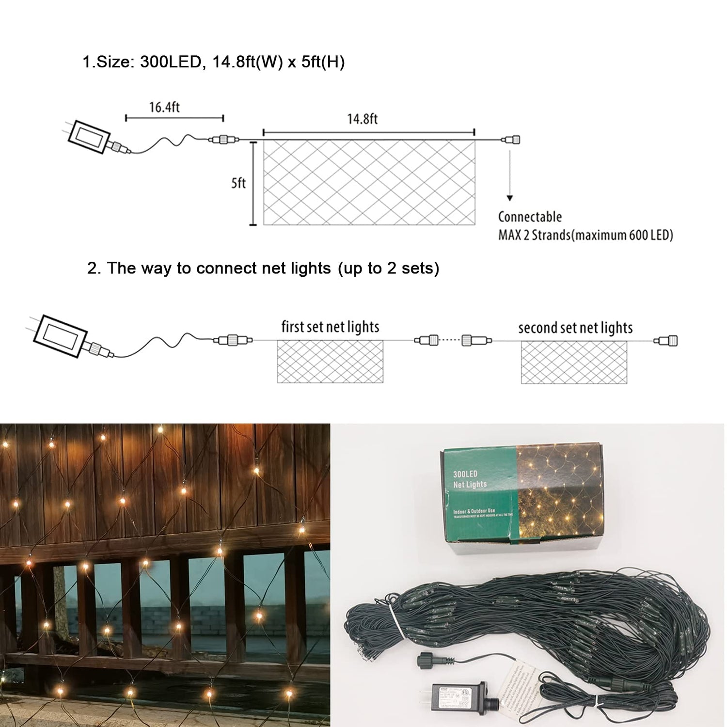 - Specifications: 300 Super bright LED with adapter. Mesh panel size is 14.8 ft x 5 ft, what's more, the net string lights could be connected end to end (Max 2 sets). All the net lights can be controlled and powered by one plug