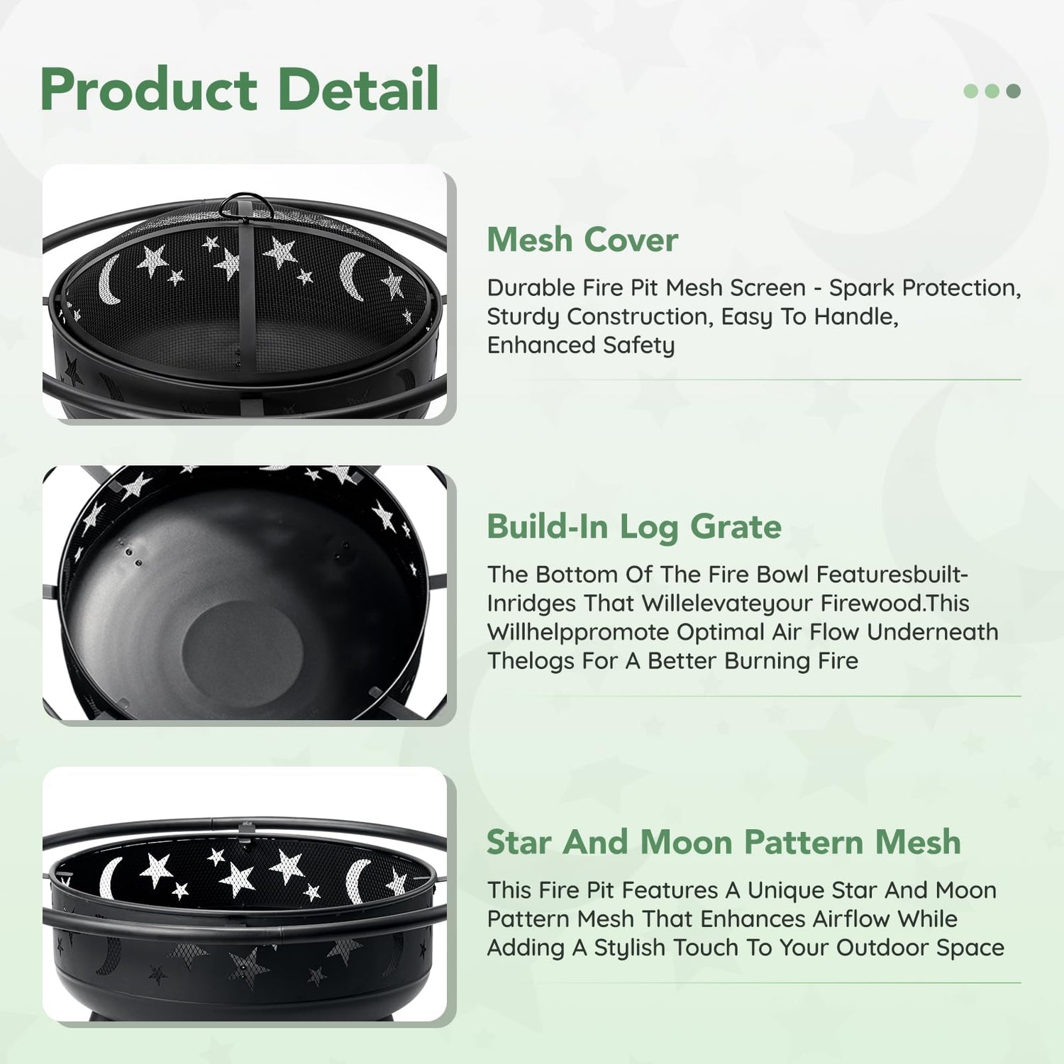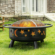 32 Inch Round Fire Pit with Mesh Cover, Fire Poker, Star and Moon Design, Metal Wood Burning Outdoor Firepit for Patio, Backyard, Garden, Bonfire Party,Perfect for Christmas, Thanksgiving, Halloween