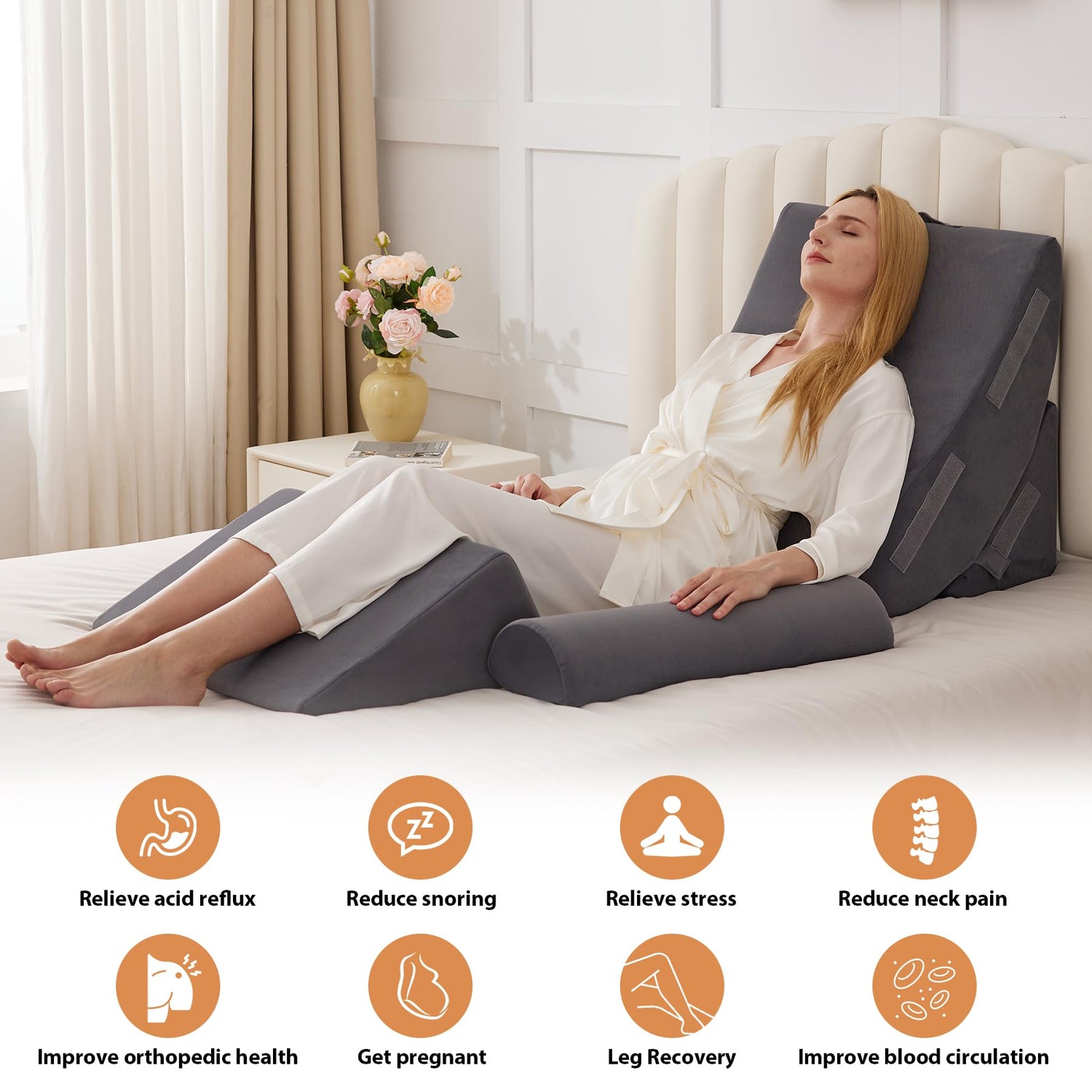 - 【Multi-function Bed Wedge Pillow Set】Our body pillow boasts a versatile design suitable for a wide range of applications, including reading in bed, watching TV, alleviating acid reflux, and enhancing overall sleep quality.BIEEZZK post surgery pillow consists of four parts that can be combined. Choose a proper angle for sitting up, lying down and sleeping on the adjustable back pillows. Leg elevation pillow can relieve discomfort and pressure on the legs and knees.