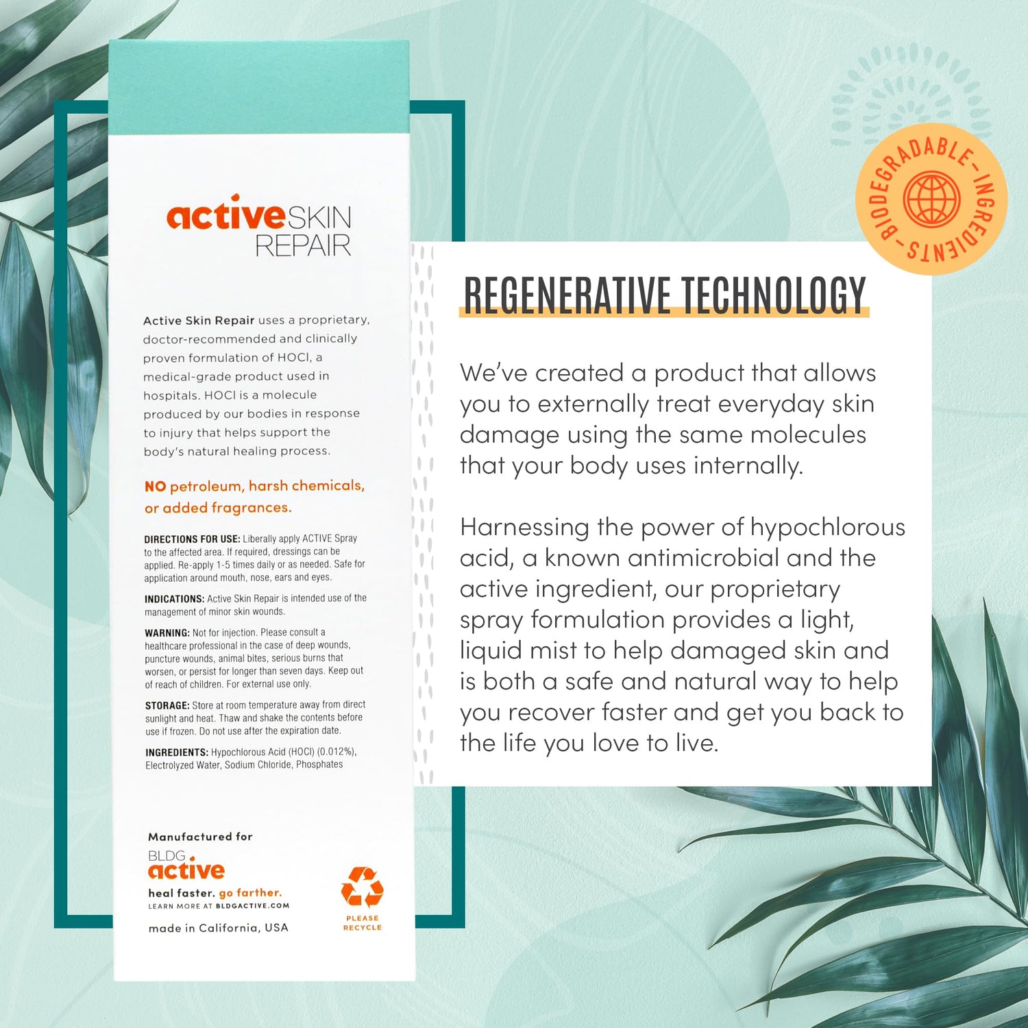 - FIRST AID HYPOCHLORUS ACID SPRAY: The technology used in Active Skin Repair is the same safe and gentle molecule used in hospitals and households worldwide; Hypochlorus Acid cleanse wounds to help skin recover faster