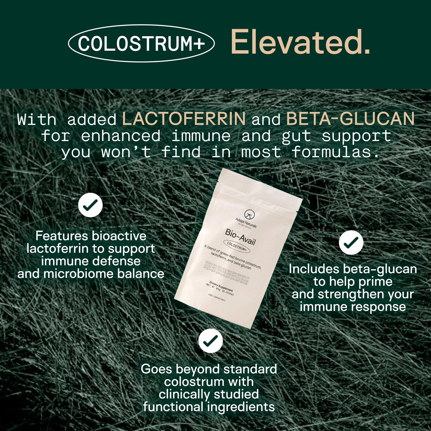 - EVIDENCE-BASED, QUALITY INGREDIENTS: Adapt Naturals Bio-Avail grass fed colostrum with bovine lactoferrin and beta glucan powder - 2500mg of colostrum, 2.5x more than average, plus 100mg of lactoferrin and 200mg of beta glucan per serving.