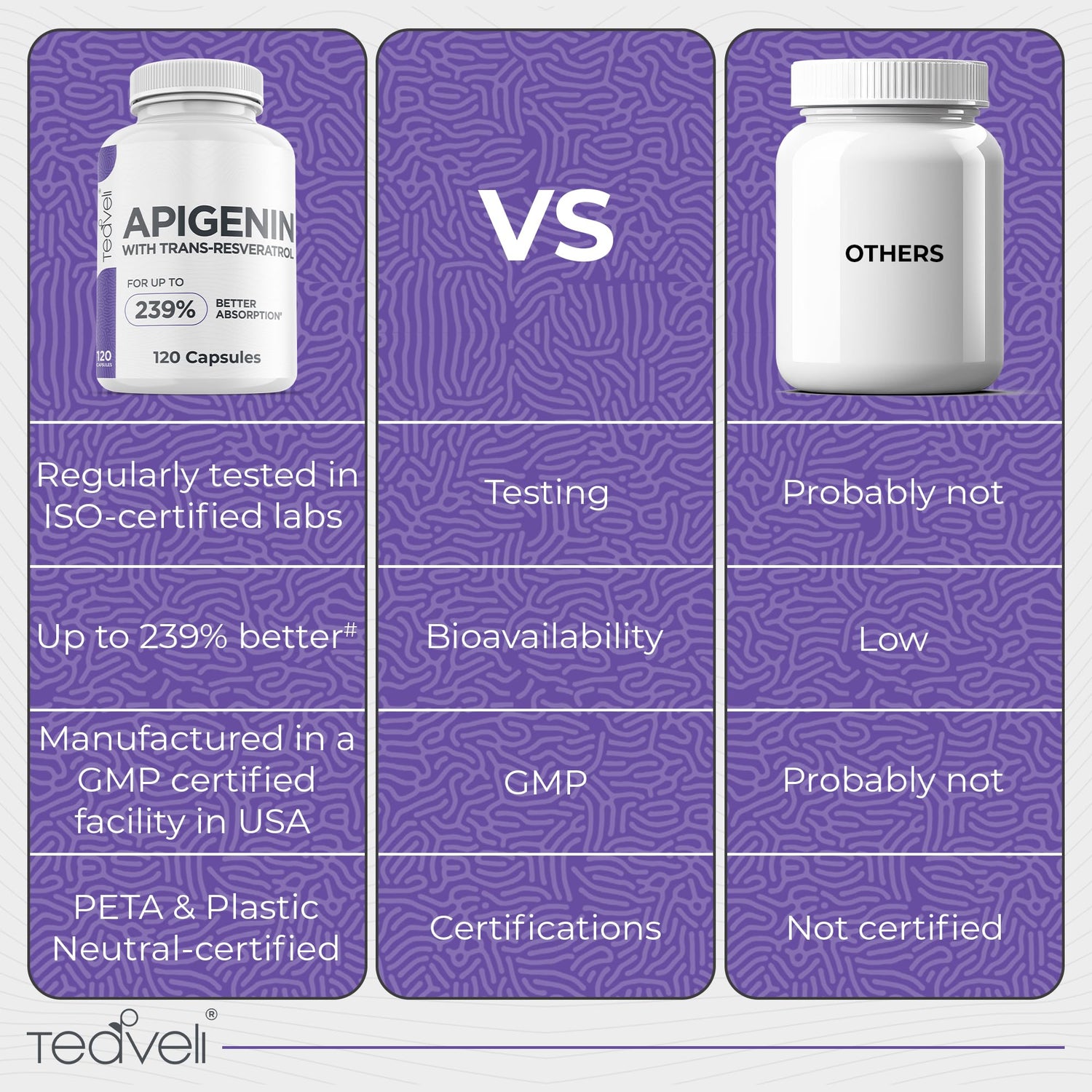 - BIOAVAILABILITY OF APIGENIN IS LOW: because of its low lipid and water solubility. Resveratrol acts as a potential bioenhancer as it can reduce the rate of apigenin metabolism. According to a study#, co-administration of apigenin and resveratrol could increase the bioavailability of apigenin supplements by up to 2.39x or 239%.