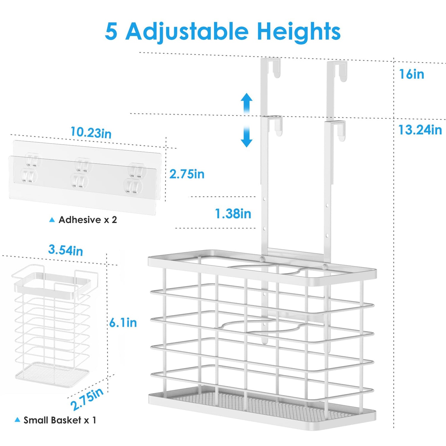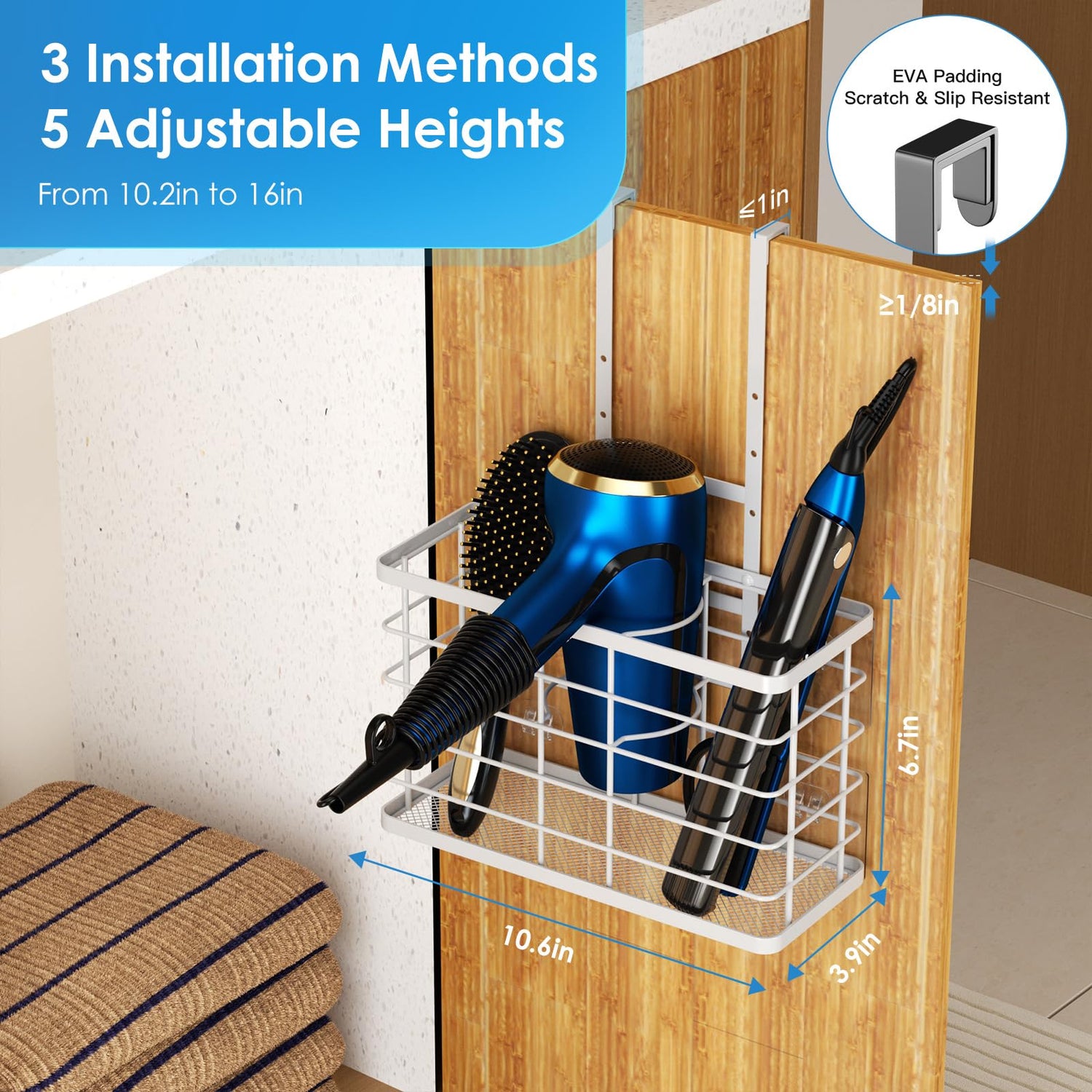 - 【5 Adjustable Height】The shortest hanging degree of hair dryer holder is 10.2", and it can be extended by 4 more heights up to 15.8", and the distance between each adjustment hole is 1.38", which can be adapted to the height of various cabinet doors. ultra thin hook with EVA foam padded to fit your cabinet door and protect the cabinet from scratches.