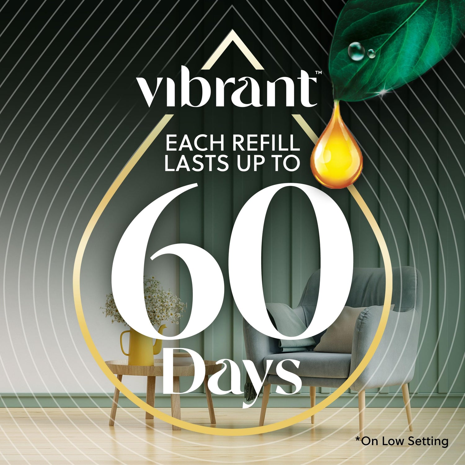 Details: Set the mood in your space with indulgent scents inspired by nature. Infused with 2x more natural essential oils* for our authentic fragrance experience. A luxurious treat for you and your space. Air Wick Vibrant Scented Oil Refills release continuous fragrance for up to 60 days (based on low setting) so your home smells welcoming. Our latest Air Wick scented oil warmer, the Advanced, has anti fading technology, a fragrance boost button, and a low-refill indicator. It continuously diffuses and carefully blends fragrance throughout your home, office, or space. *Vibrant fragrance infused with two times more natural essential oils vs regular Air Wick Scented Oils.
