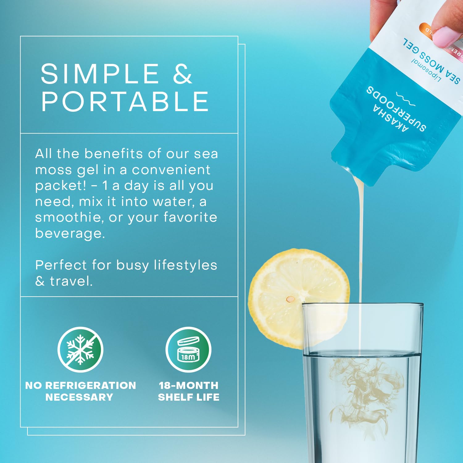 - LIPOSOMAL DELIVERY IN PORTABLE SACHETS: This sea moss gel comes in 30 convenient 15ml liposomal pouches — no refrigeration or measuring required. Simply tear, squeeze, and enjoy straight from the packet or mix into water or your favorite drinks or snacks.