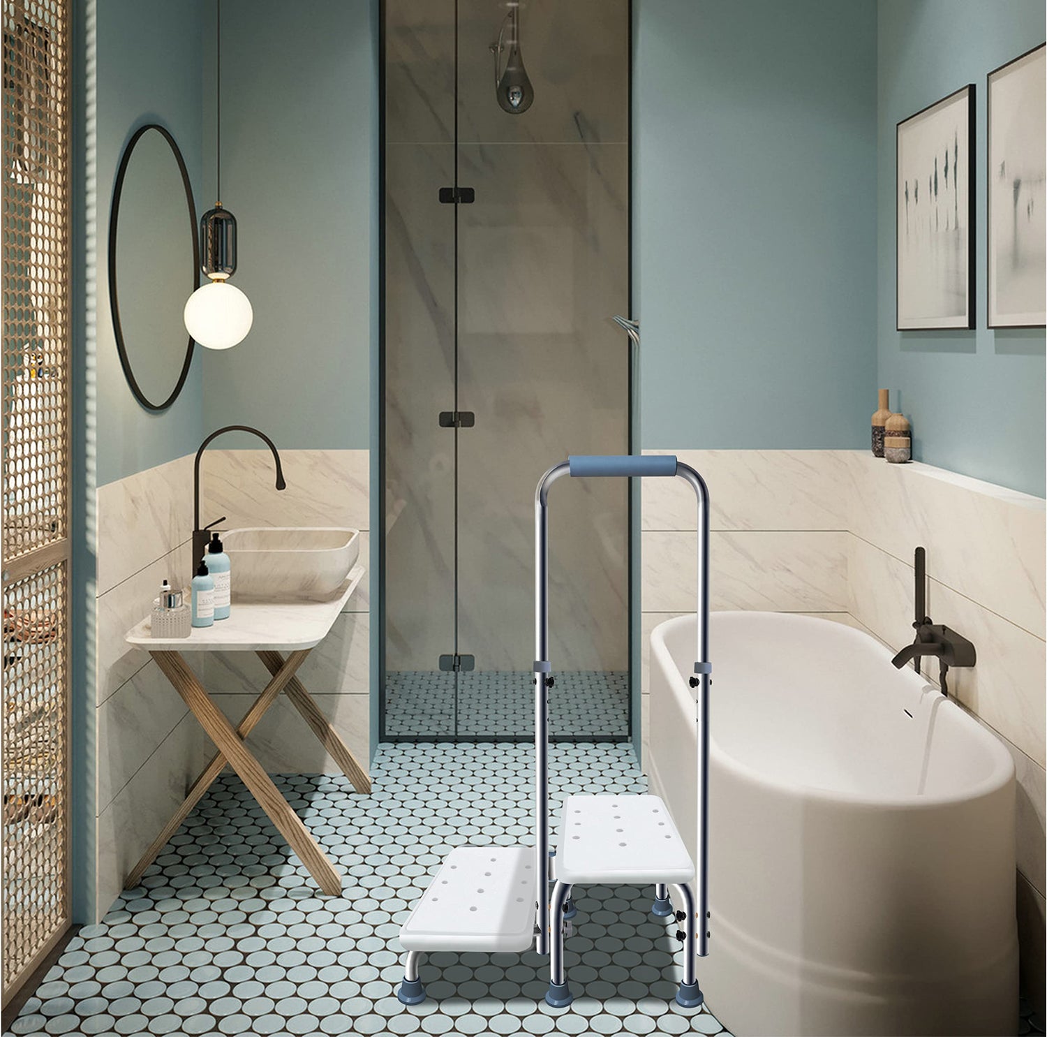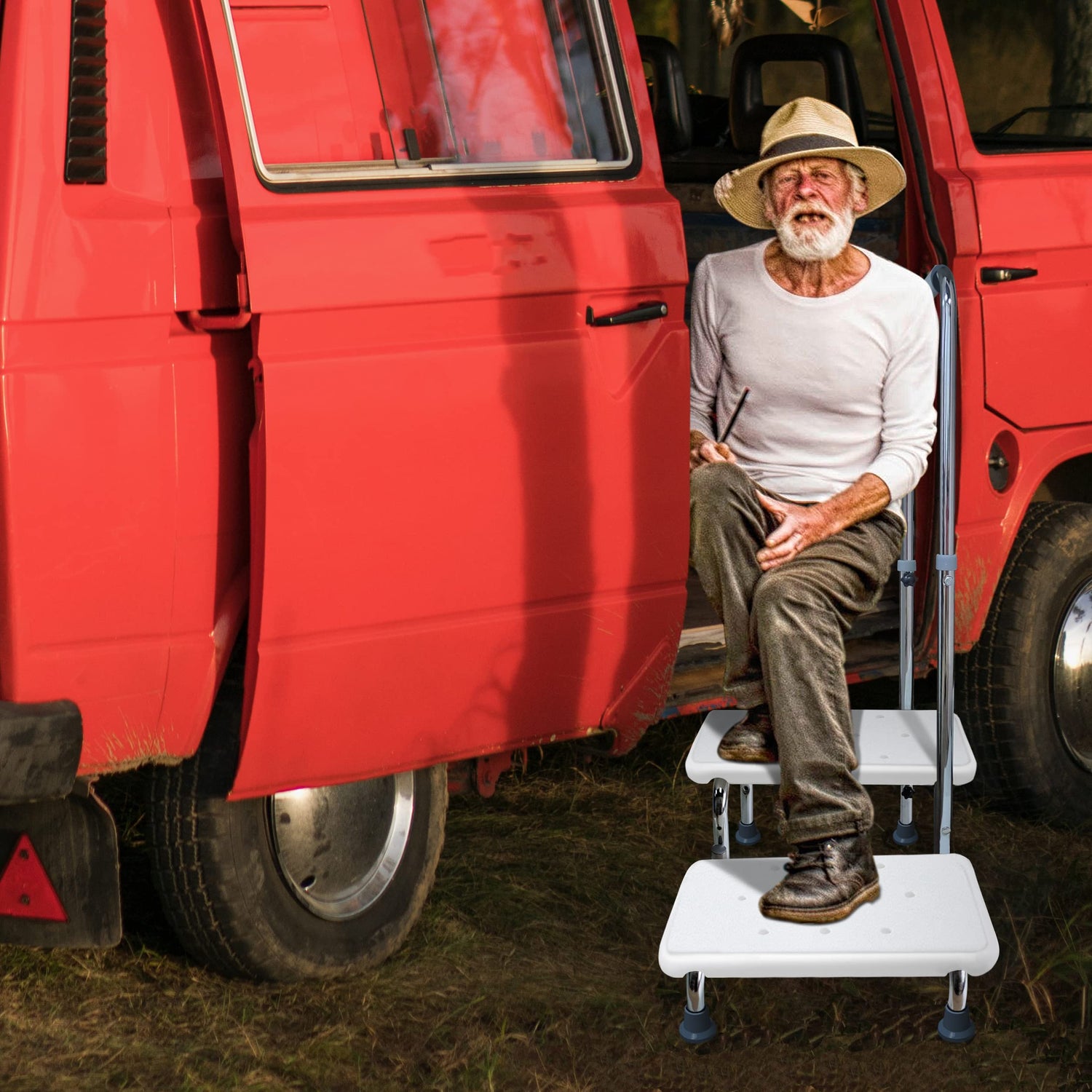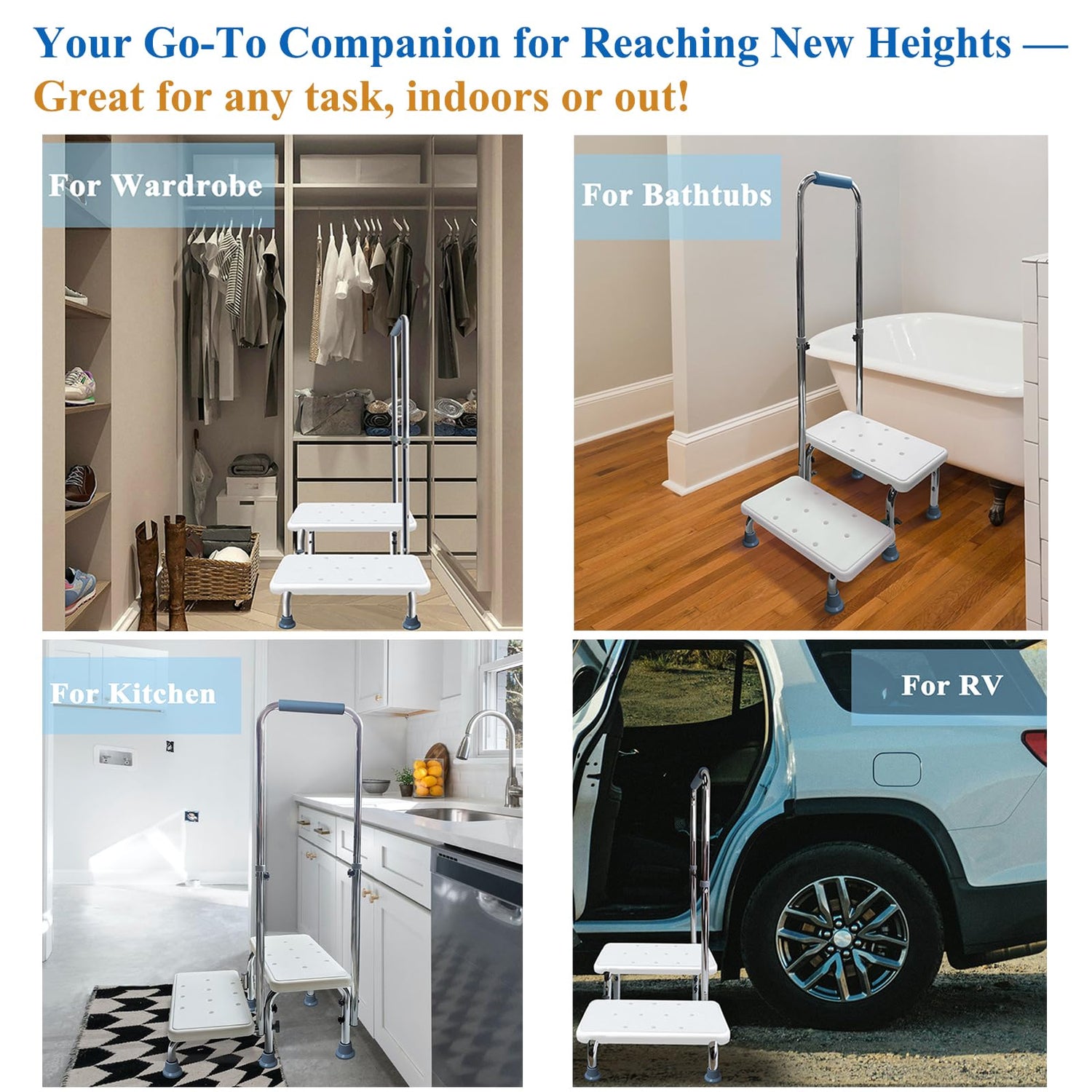 - Versatile Bed step and RV Step or Bed Stool Aid: 2 steps design is convenient for people who have recent knee/hip problems, or help recovering people in hospital get into higher beds, vehicles, bathtub or in and out of the room. With its enlarged platform, the stool provides users with ample space to stand their feet comfortably. Our 2 steps step stool has a Long Support Handle can help the person maintain the body's balance when standing